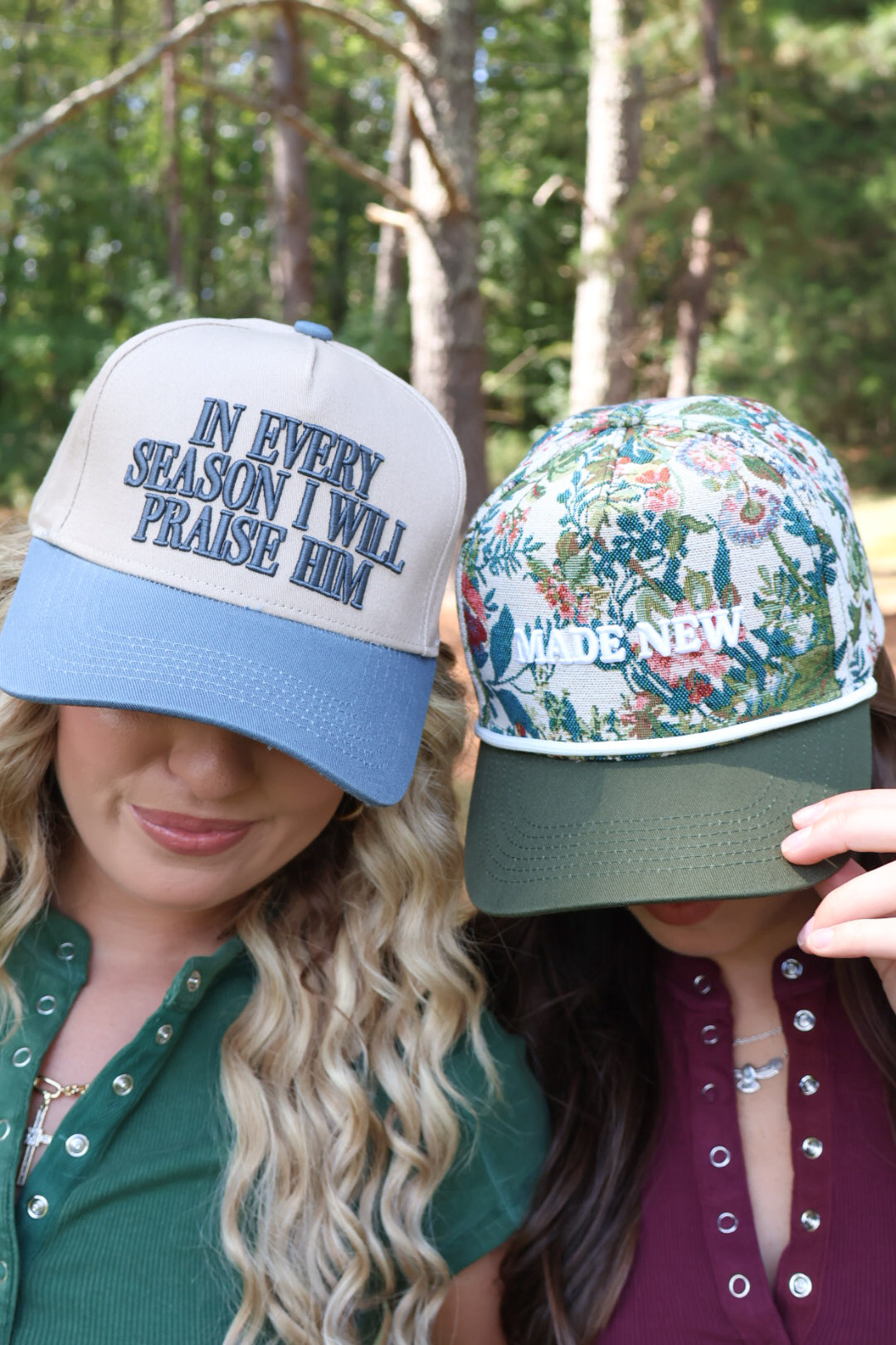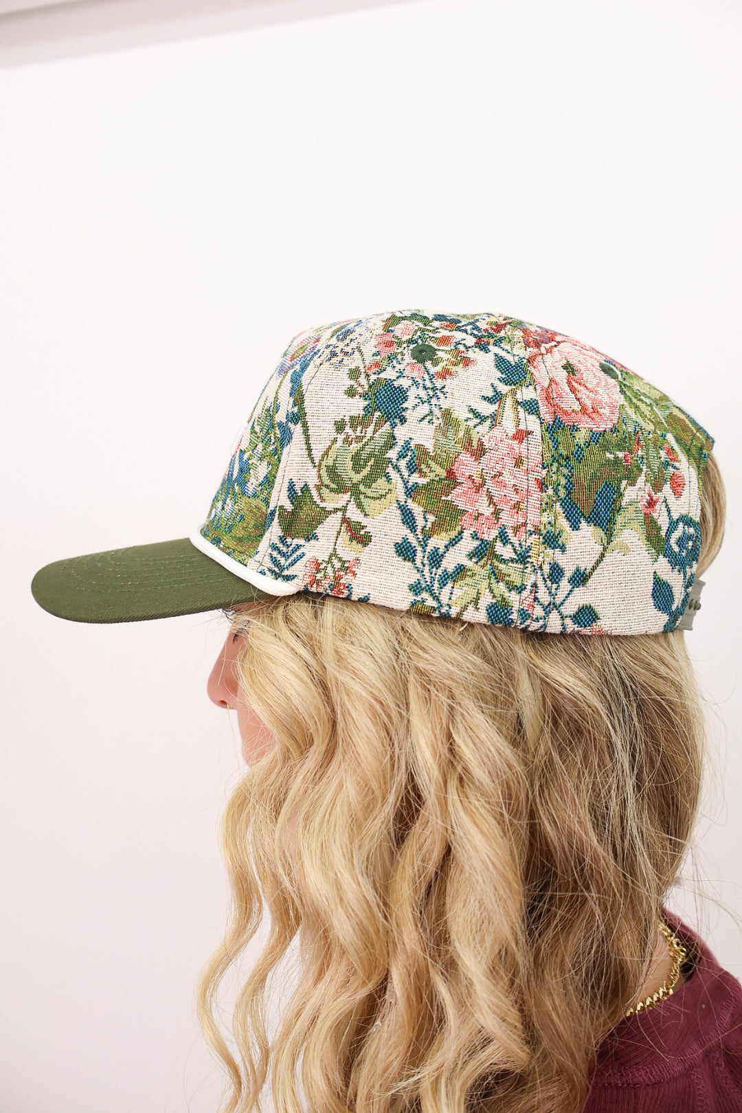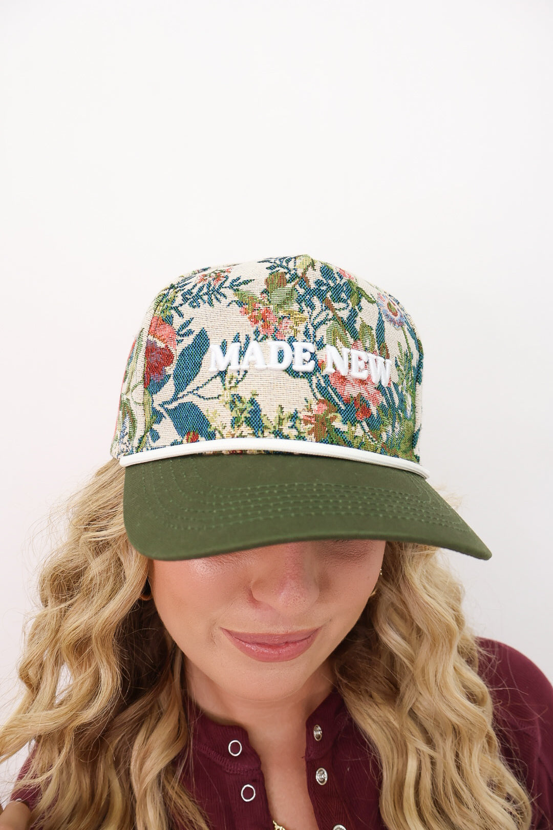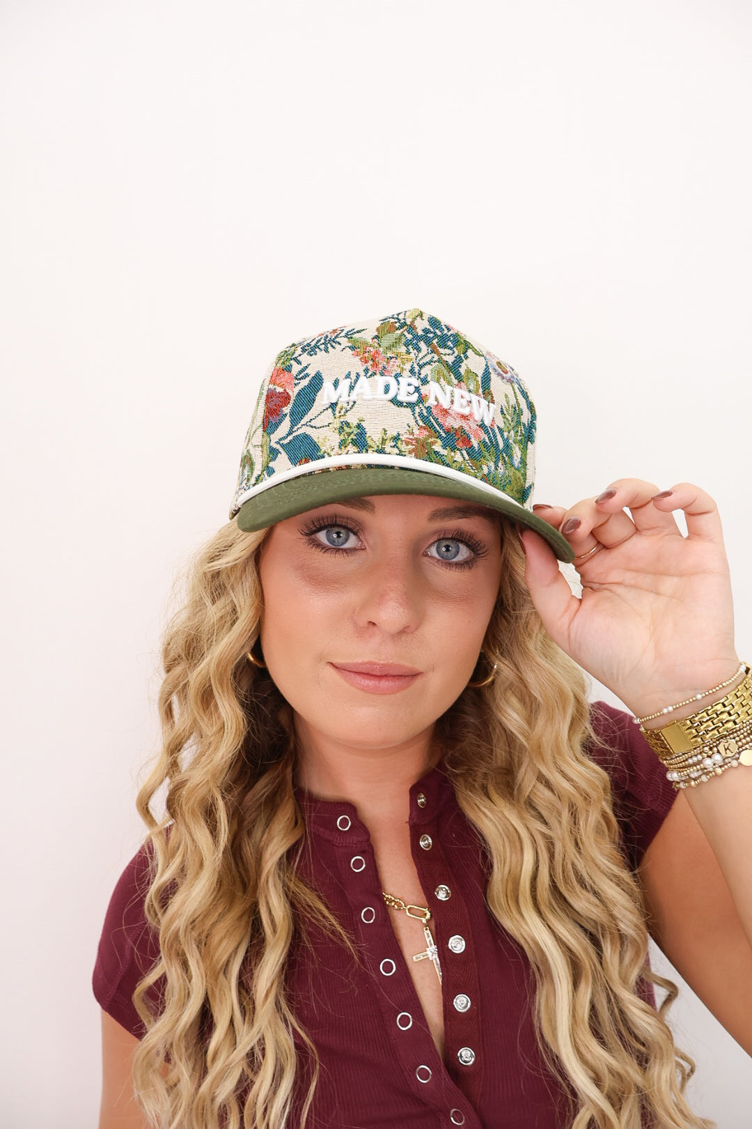 A hat with heart and meaning—our Made New embroidered cap is more than just an accessory, it’s a reminder of grace and fresh beginnings. Designed in a vintage floral tapestry print with an olive green bill, this hat blends style with sentiment. The classic embroidered lettering pops beautifully against the patterned background for a thoughtful finish. With its adjustable back strap, you’ll always get the perfect fit.
