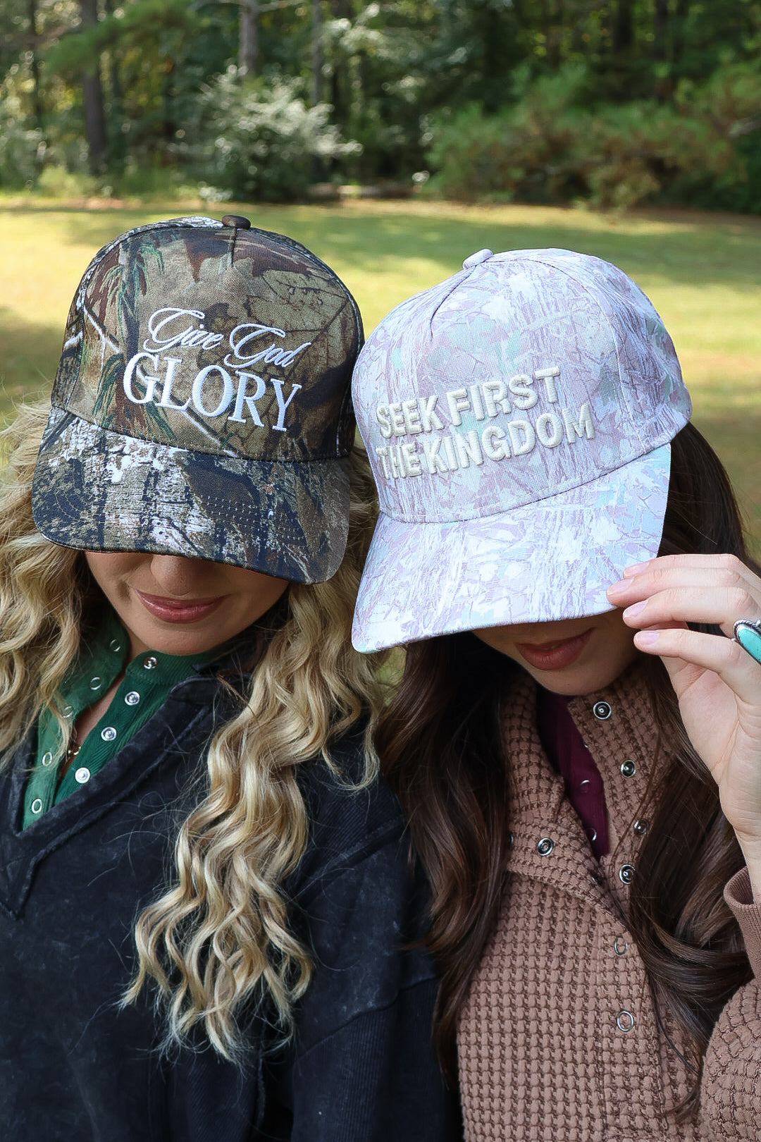 pastel camo hat, Seek First the Kingdom cap, Christian embroidered hat, women’s camo baseball cap, faith inspired accessories