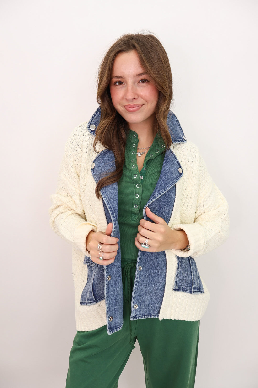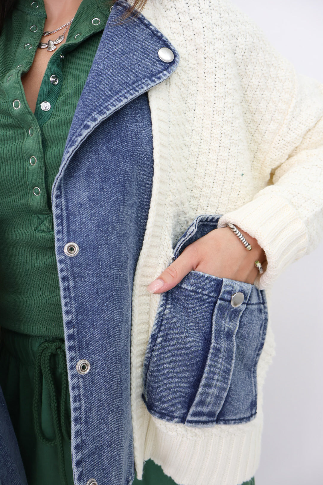 mixed fabric cardigan, denim trim sweater, oversized knit cardigan, trendy layering cardigan, mixed denim and sweater cardigan