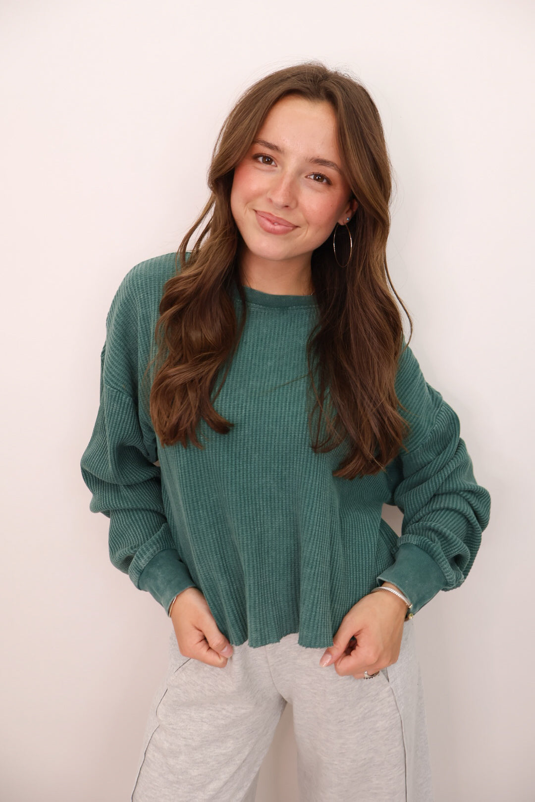 Meet your new layering essential: this thermal boxy top! Designed with a raw hem and a perfectly slouchy fit, it’s the kind of piece you’ll throw on over everything. The lightweight waffle knit gives just the right amount of texture, while the relaxed shape makes it easy to half-tuck into jeans, or pair with your favorite leggings or lounge shorts.