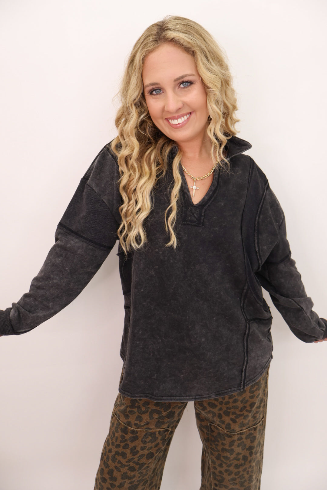 black mineral wash pullover, vintage washed sweatshirt, oversized casual pullover, women’s trendy lounge top, casual fall top