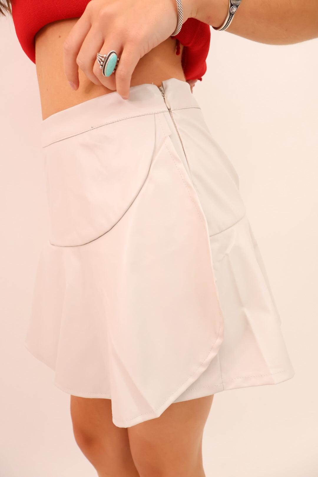 Bring elevated edge to your gameday look with this cream faux leather wrap skort. The sleek faux leather finish instantly dresses up any outfit, while the wrap-front overlay keeps it flirty and feminine. Built-in shorts ensure all-day comfort and coverage, so you can cheer, mingle, and celebrate without a second thought. The neutral cream hue pairs effortlessly with bold team colors, metallic accessories, or chic neutrals for a more understated vibe.