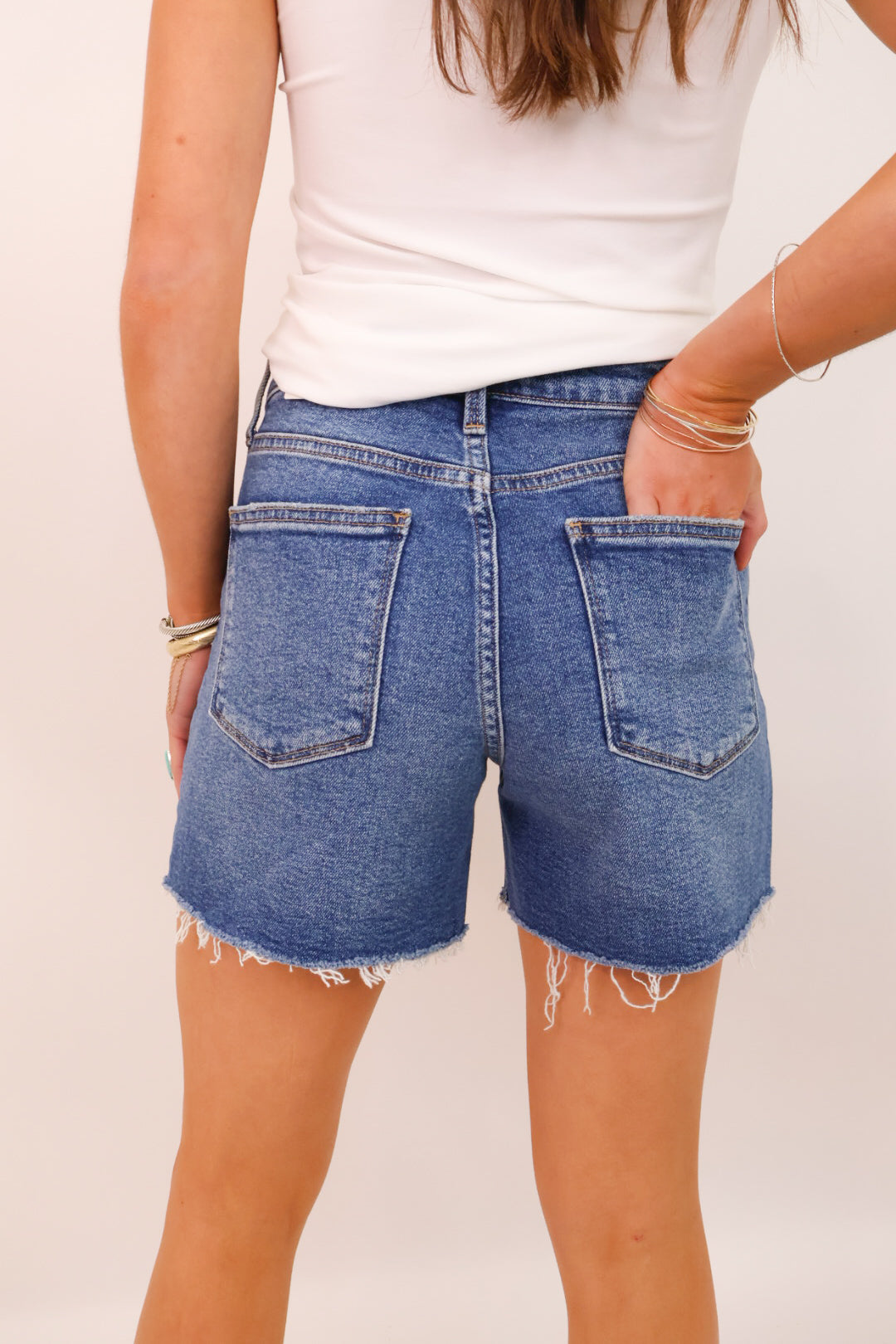 Meet your new go-to denim mom shorts—a perfect blend of comfort, style, and effortless cool. Designed with a flattering high-rise fit, these shorts accentuate the waist for a smooth, tailored silhouette while offering a longer length for extra coverage. The relaxed fit and raw hem makes them ideal for everything from casual weekend outings to summer adventures. Pair them with a breezy blouse or an easy tee for a laid-back, chic look.