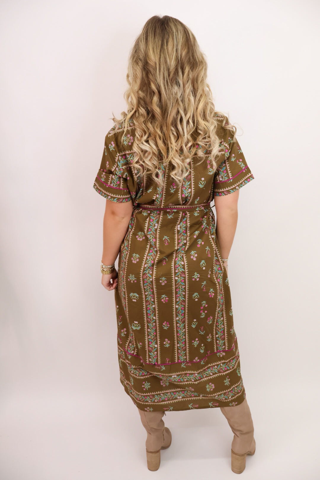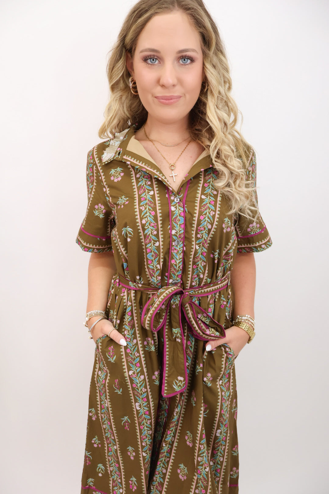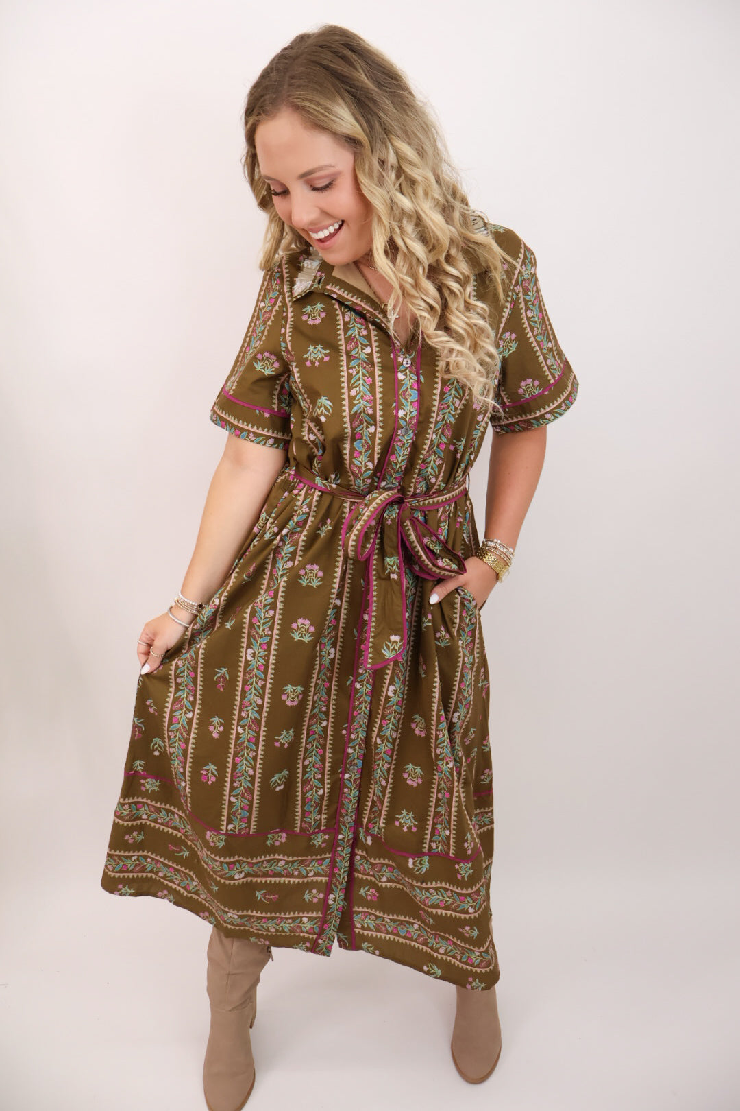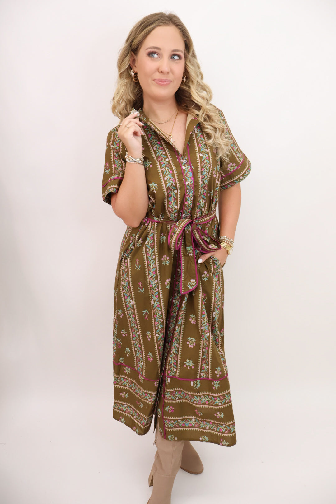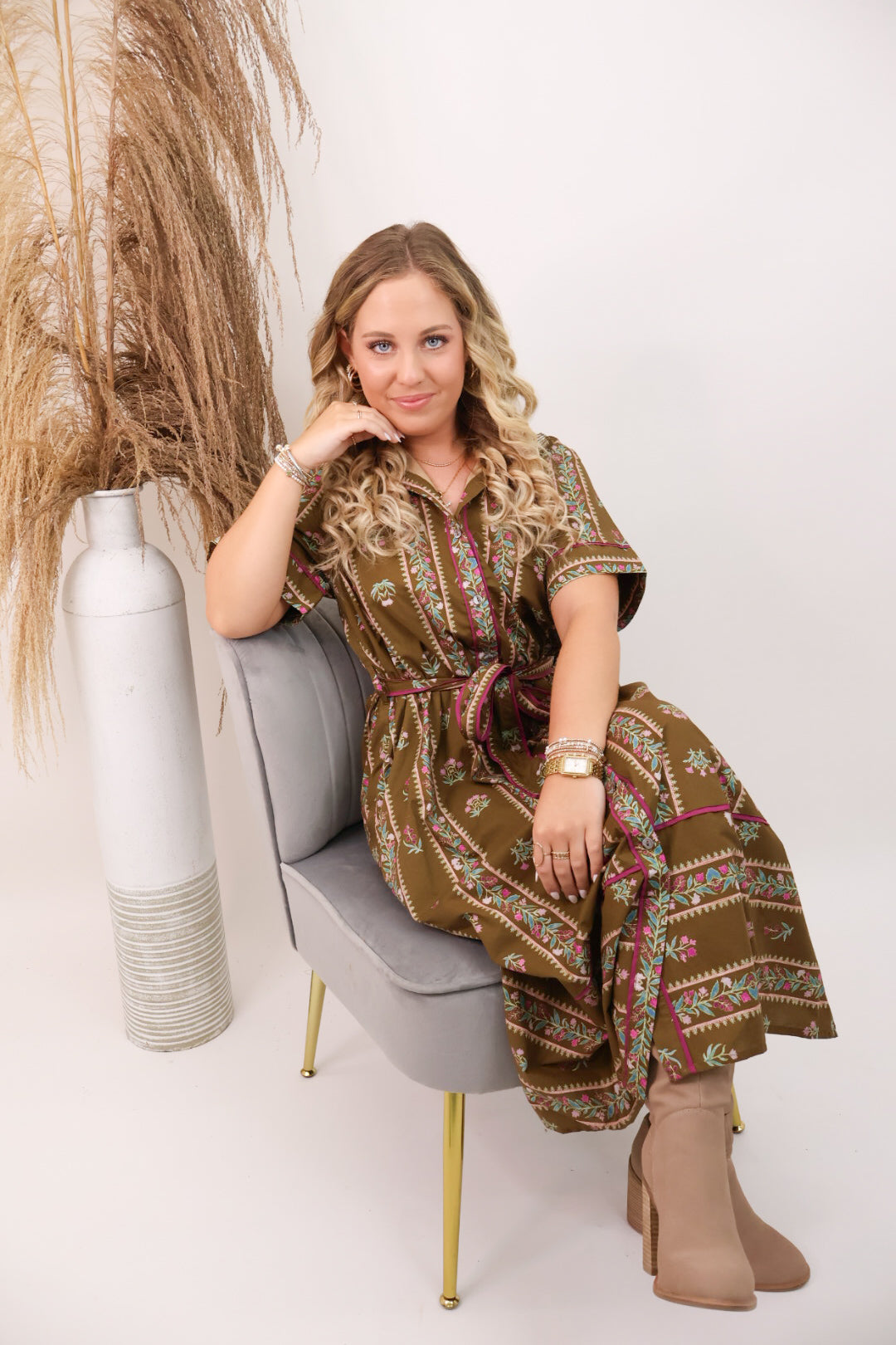 This olive midi dress with magenta border print is your new “effortlessly put-together” piece! The belted waist defines your shape while still giving you a comfortable, flowy silhouette. It’s the dress you’ll reach for on a busy weekday when you need something polished for work, or on Sunday afternoons for church and brunch. Pair it with boots and gold jewelry now, then swap for sandals come spring.