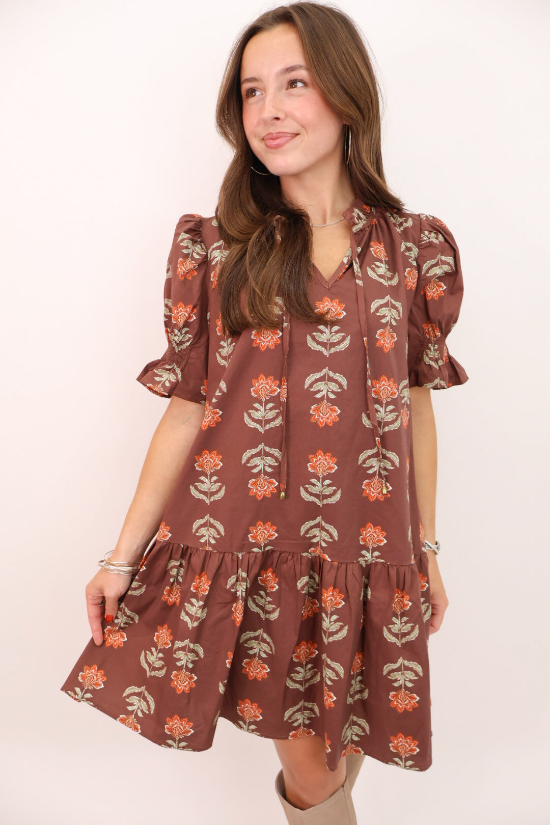 floral fall dress, brown floral mini dress, orange flower print dress, tiered puff sleeve dress, easy fall floral dress, fall family photo dress