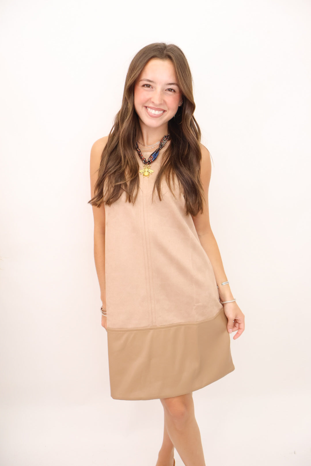 Camel Faux Suede and Leather Shift Dress