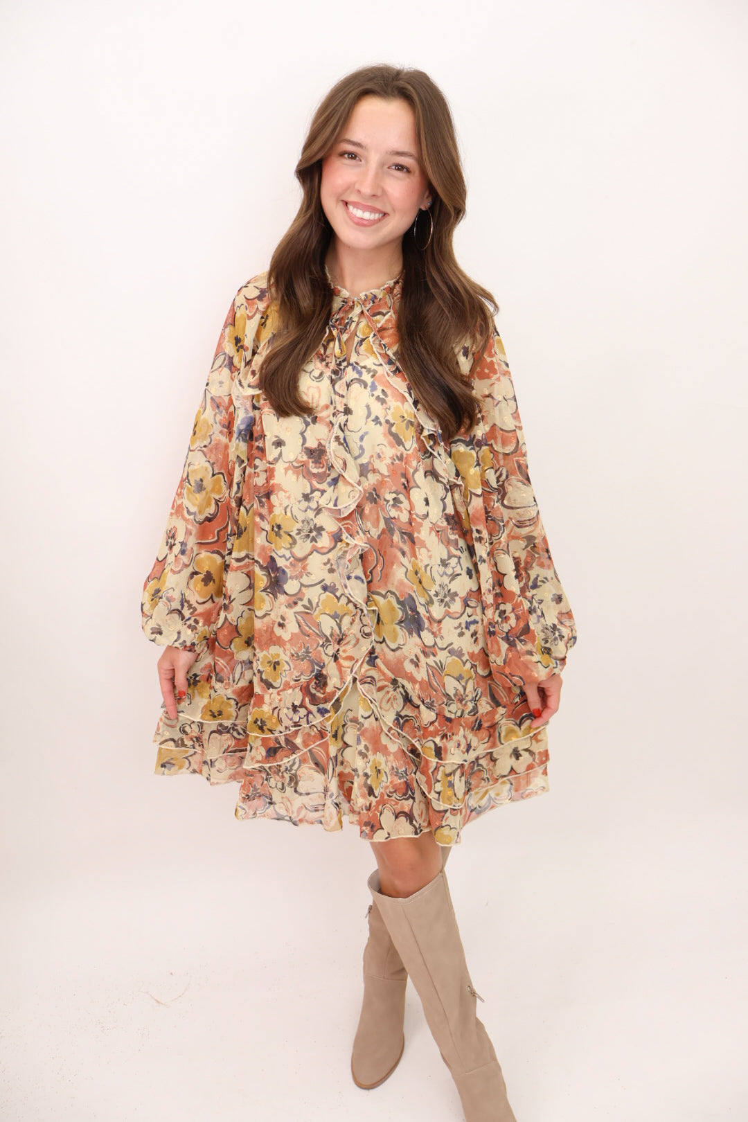 gold thread floral dress, chiffon mini dress, Thanksgiving outfit ideas, fall floral dress, long sleeve fall dress, fall floral dress