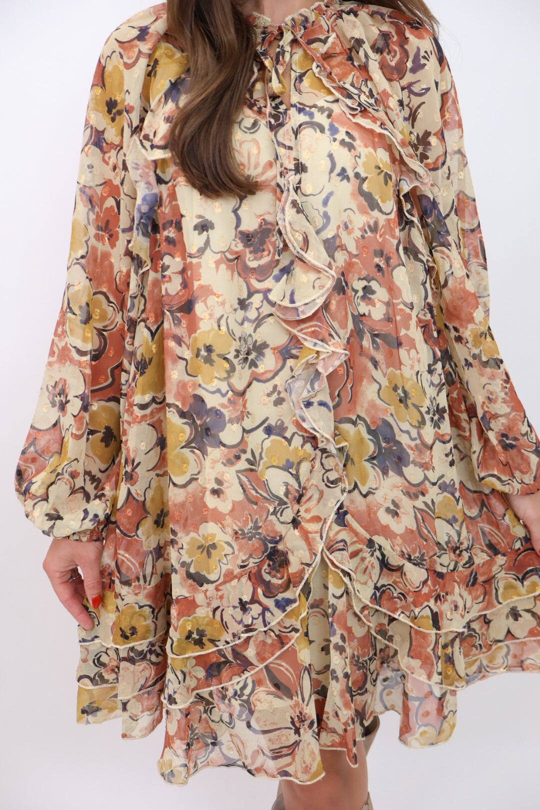 Romantic and effortlessly feminine — our Gold Thread Floral Dress is everything we love about fall dressing! Designed in a lightweight chiffon with metallic gold threading throughout, it catches the light beautifully with every move. The rich floral print, flowy silhouette, and soft lining make it equal parts comfortable and elevated. With a generous fit and length, it’s perfect for those who want a dress that feels easy to wear but still makes a statement.