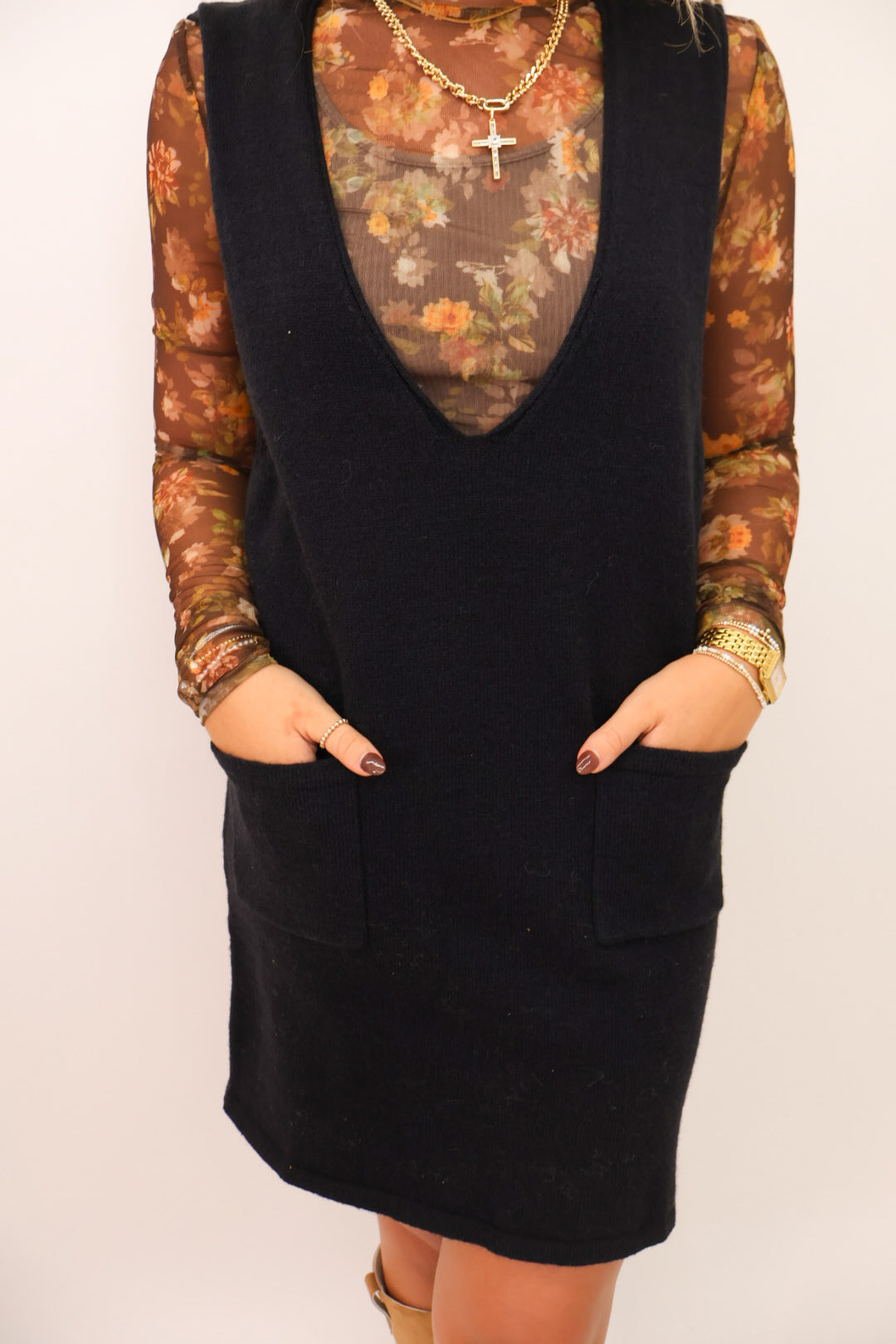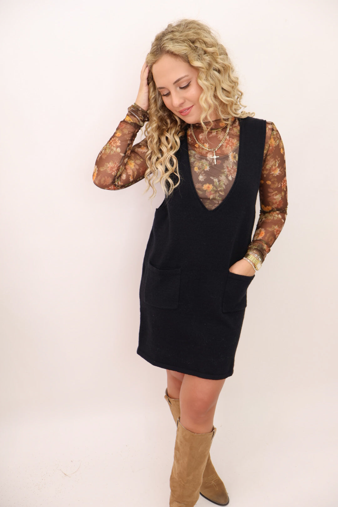 Classic, cozy, and endlessly versatile — our Sweater Jumper Dress is your new fall favorite! Designed in a soft knit with just the right amount of structure, it’s an easy piece to throw on and instantly look put-together. The deep V-neckline and front pockets give it that effortless, modern feel, while the relaxed silhouette keeps it flattering and comfortable. Whether layered over a fitted turtleneck, a floral mesh top, or a basic tee, this one can take you from the pumpkin patch to Thanksgiving dinner in style!