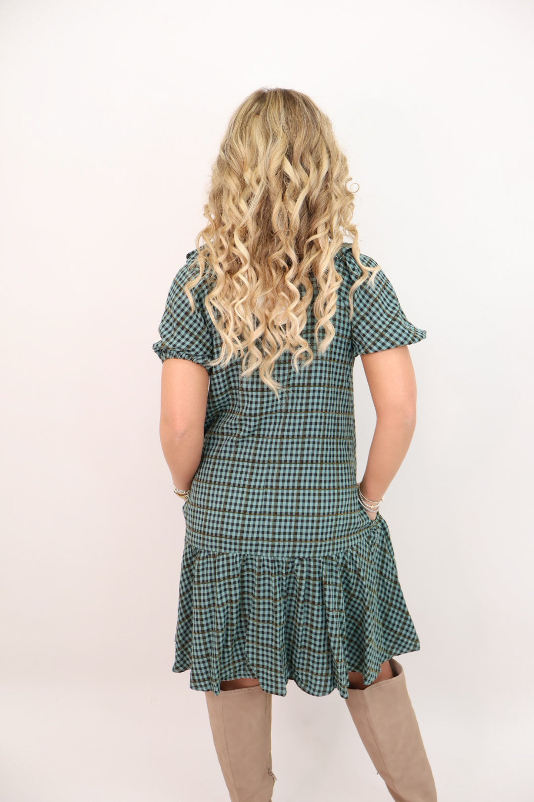 Meet your new fall favorite — this green plaid bow tie dress is equal parts classic and fun, designed to make you feel put-together without even trying. The charming plaid pattern in shades of forest green, black and chocolate brown brings all the cozy fall vibes, while the contrasting brown bow at the neckline adds the sweetest finishing touch.