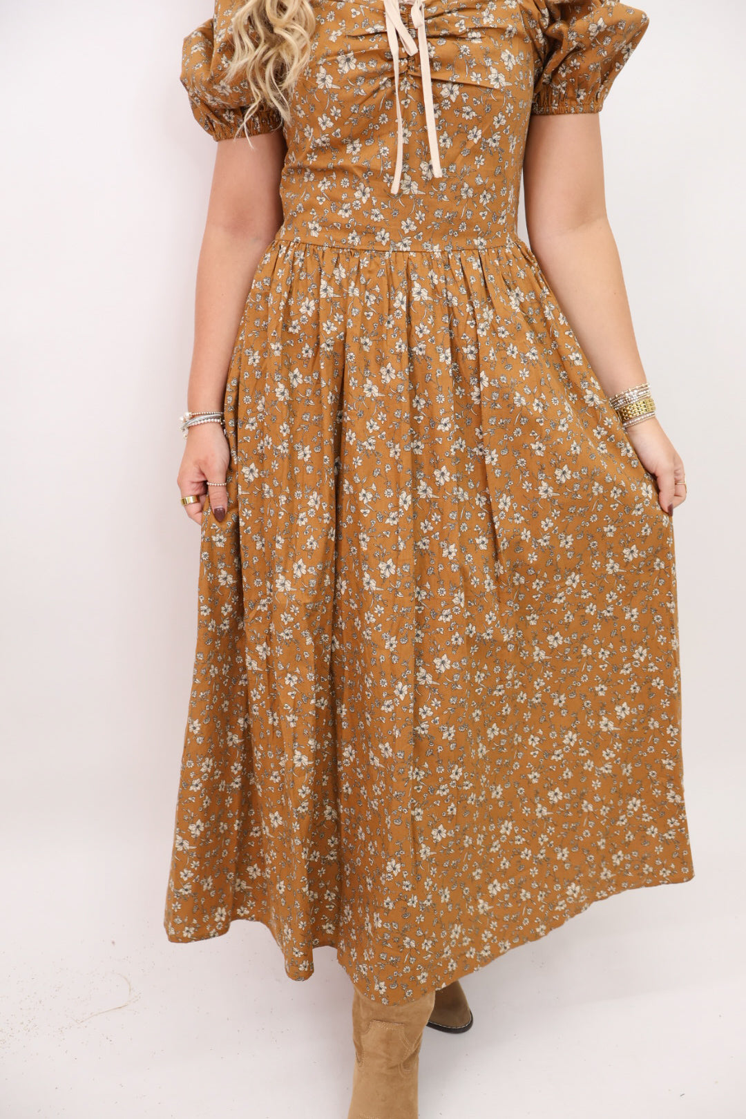 Fall in love with florals all over again in this effortlessly charming midi dress. Featuring a soft mustard base with delicate ivory blooms, this piece captures that cozy-yet-elevated Thanksgiving look we all love. The smocked bodice flatters every shape, while the puff sleeves and dainty cream tie detail add a romantic, feminine touch. The lightweight woven fabric drapes beautifully and moves with you — perfect for family photos, fall weddings, or casual brunch dates. Pair it with tall boots and gold jewelry for a look that’s polished but still comfortable enough for all-day wear.
