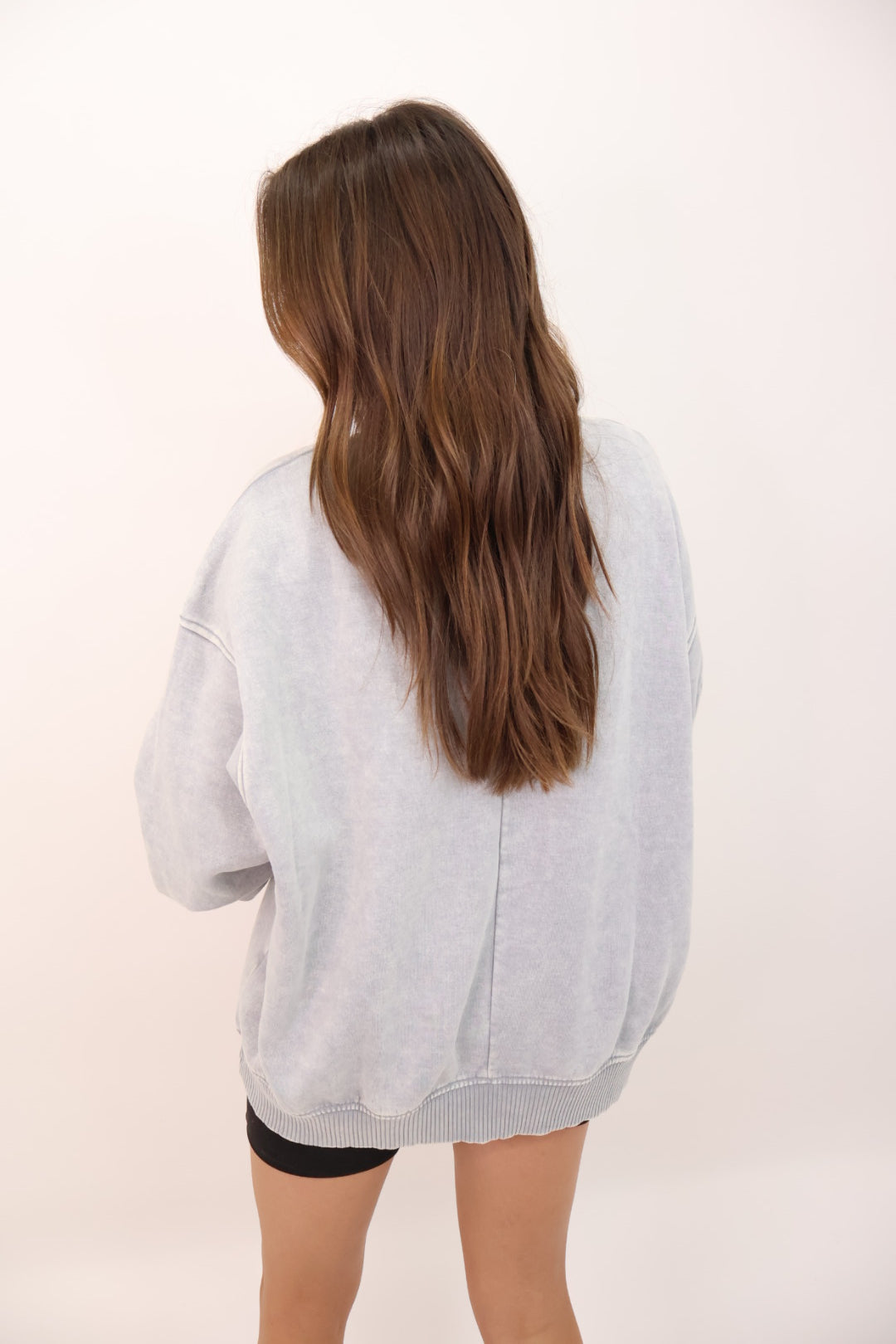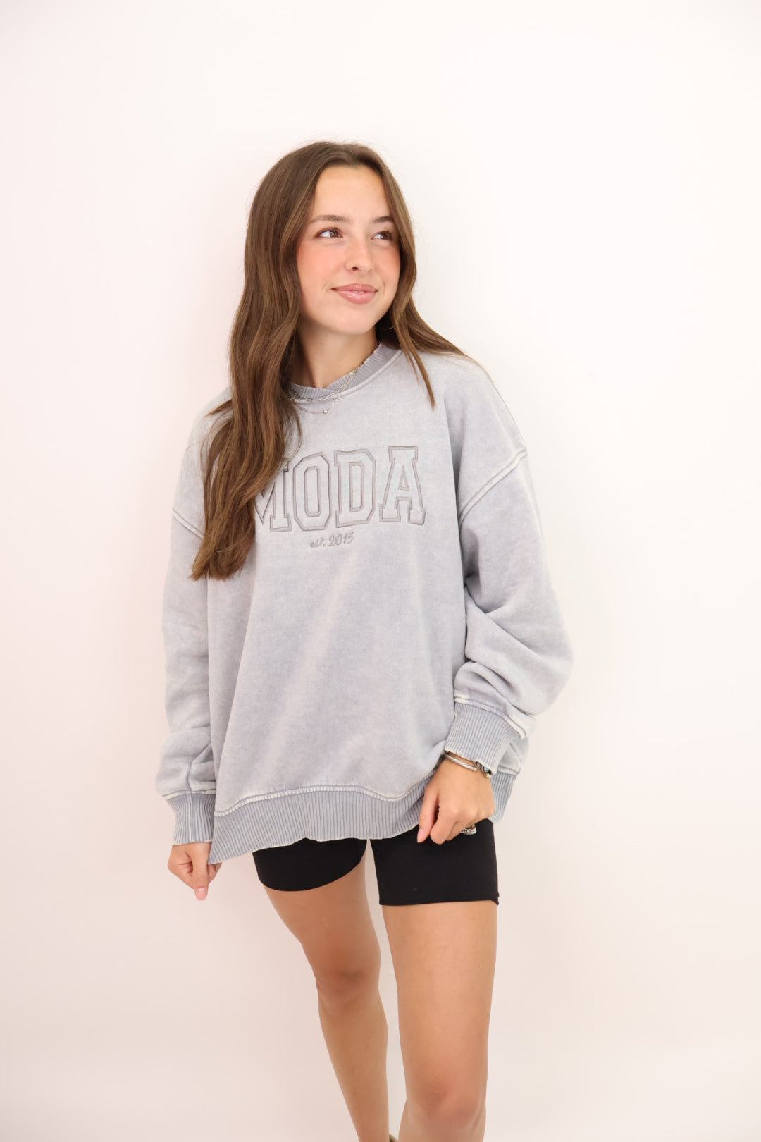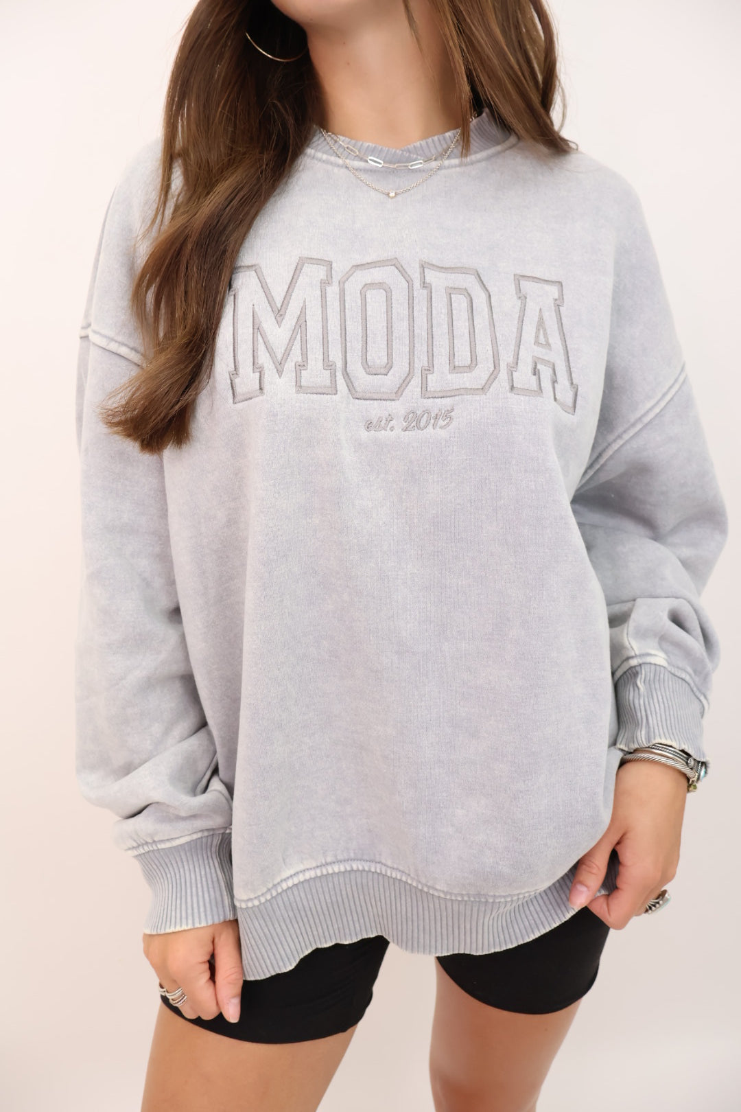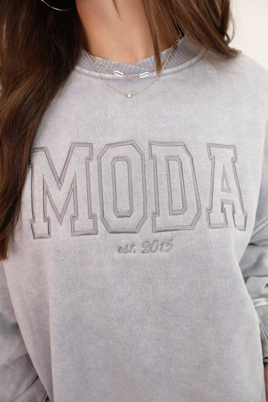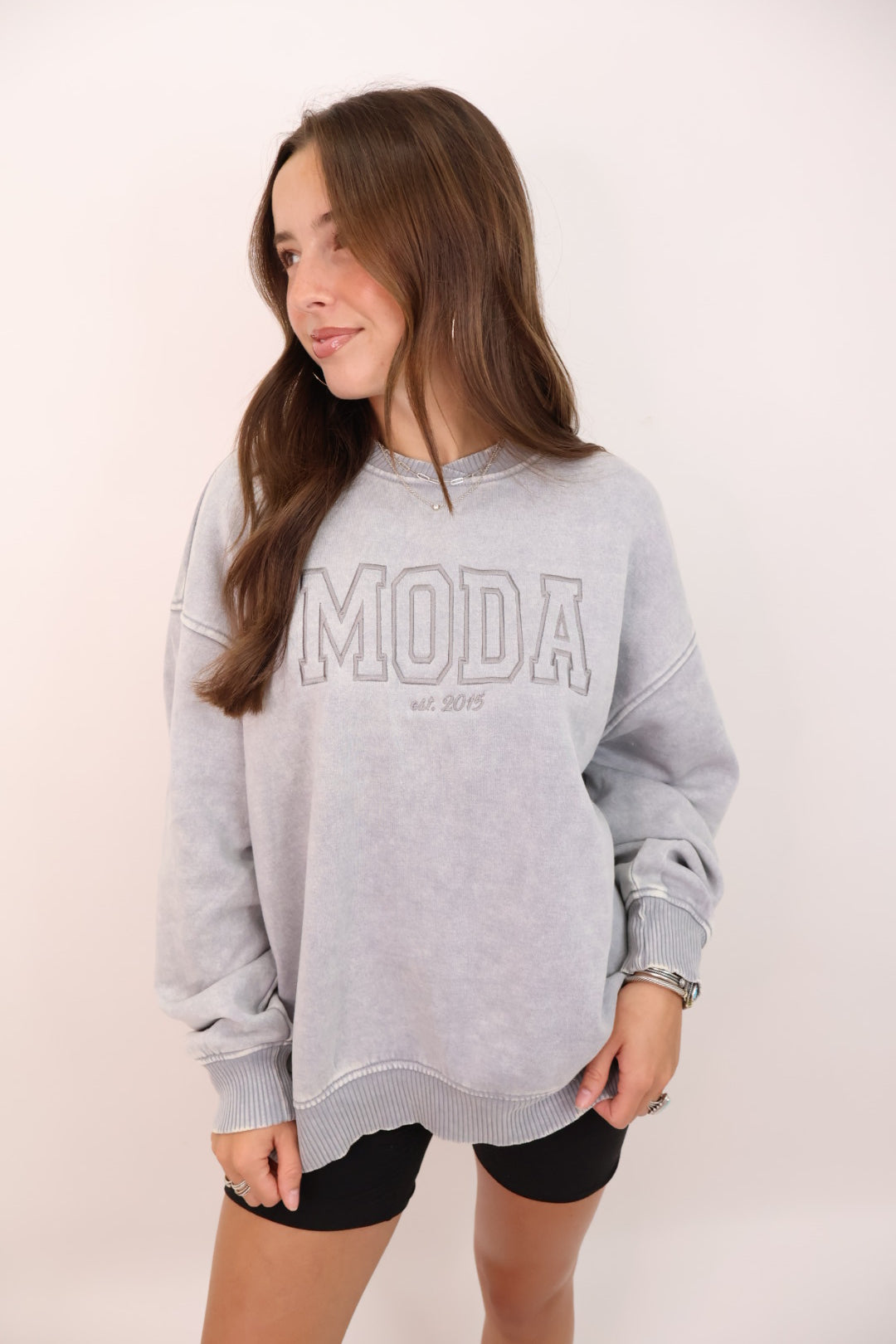 Cozy up with our exclusive embroidered pullover! Designed with an oversized fit, this sweatshirt is perfect for layering on chilly days or lounging at home in style. The tonal “MODA est. 2015” embroidery across the front adds a personal, elevated touch that makes this piece extra special—it’s not just a sweatshirt, it’s part of our story.