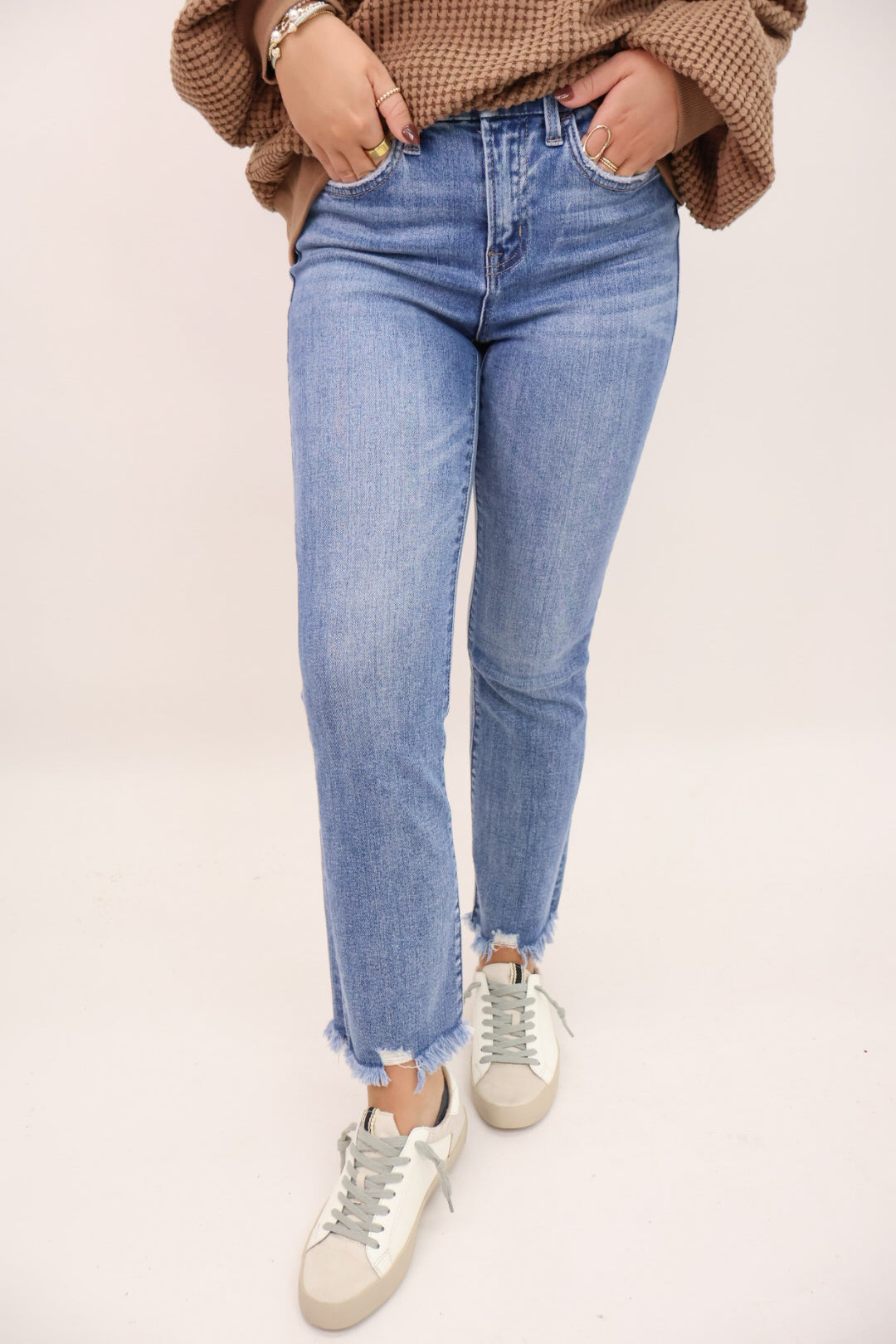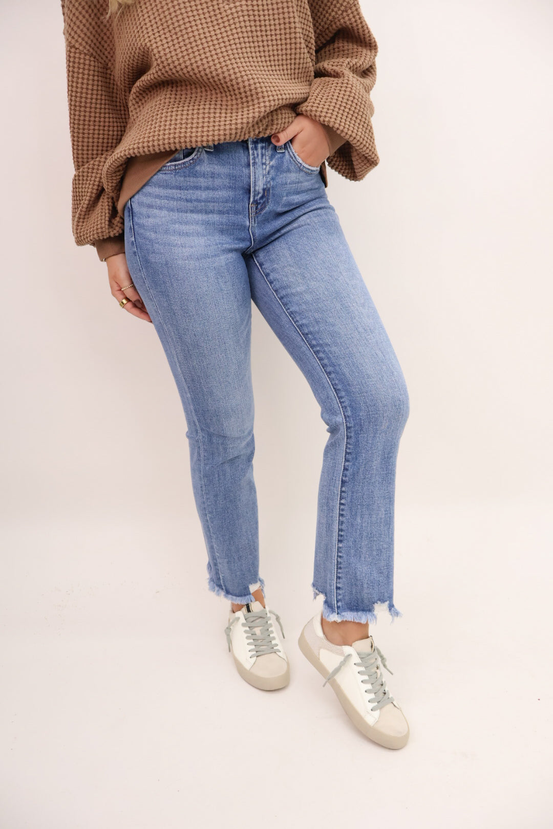 - Cropped length—perfect for pairing with sneakers, sandals, or boots