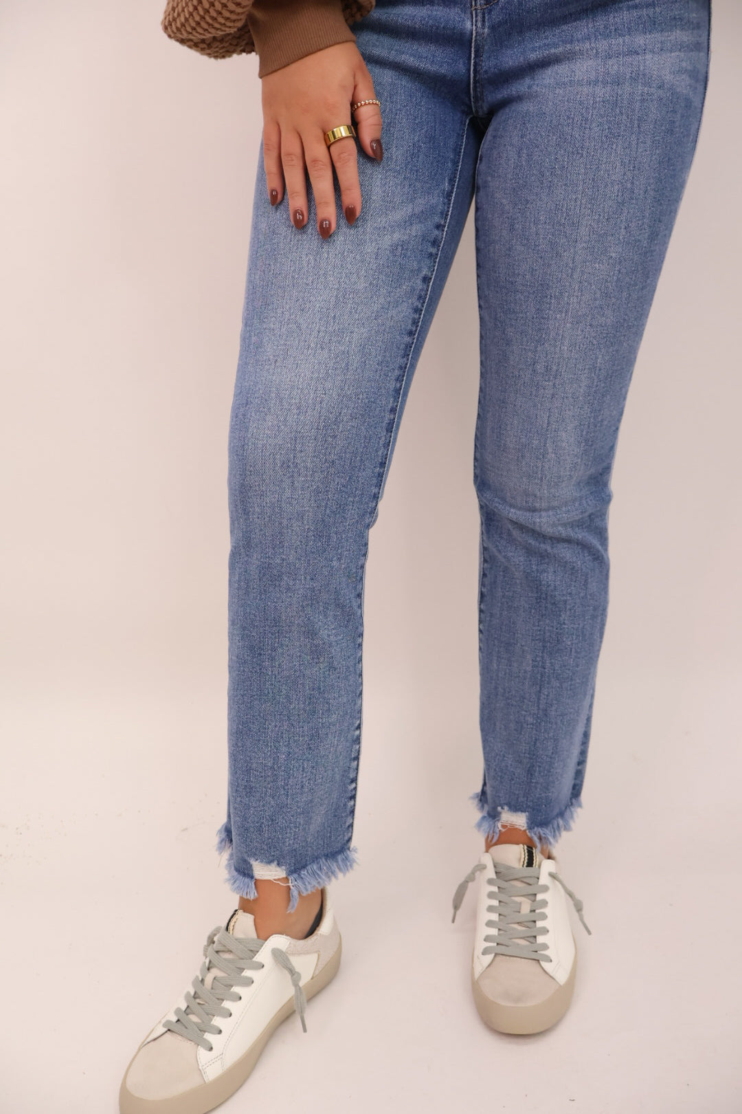 - Distressed hem for a trendy, lived-in look