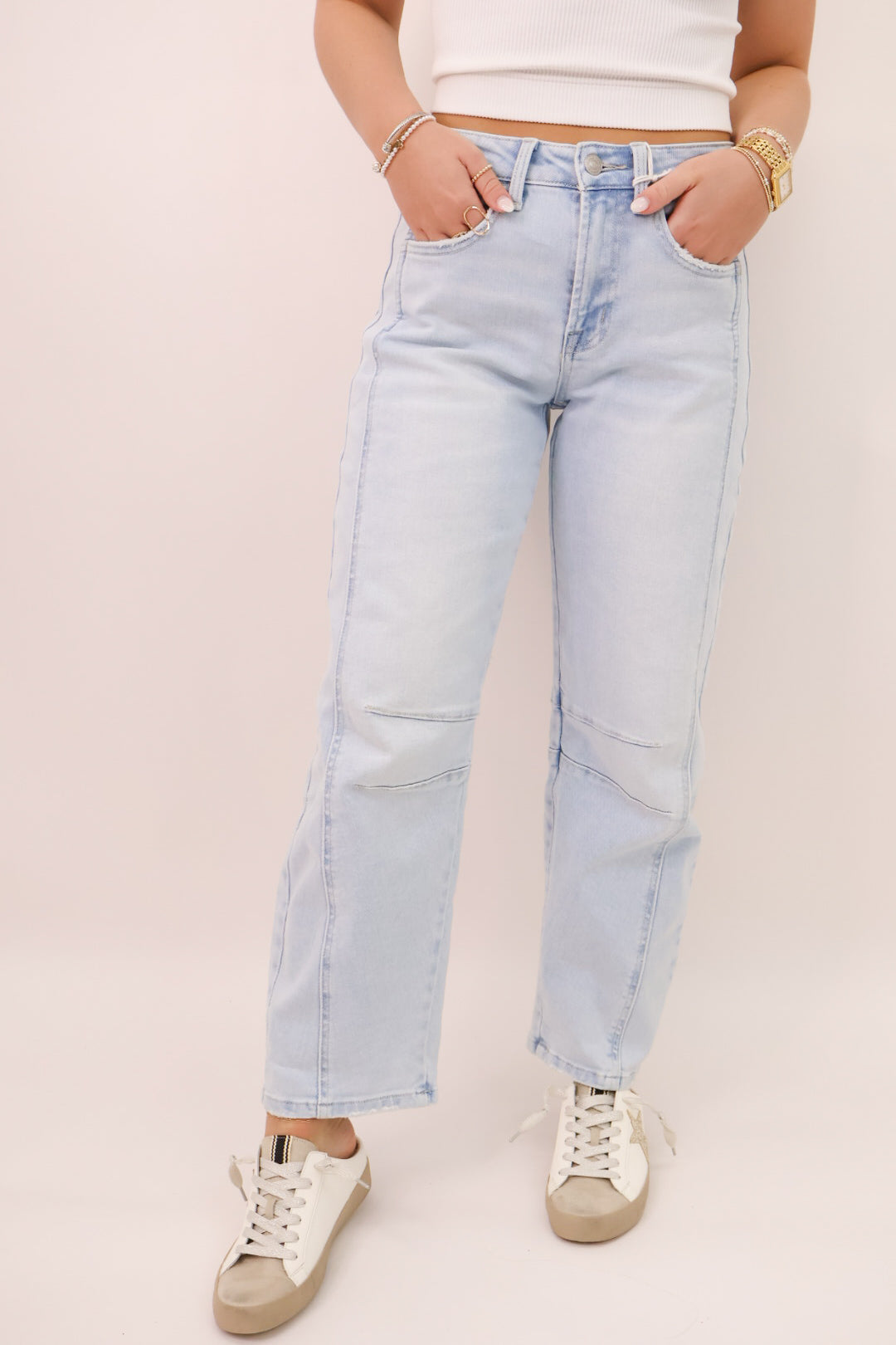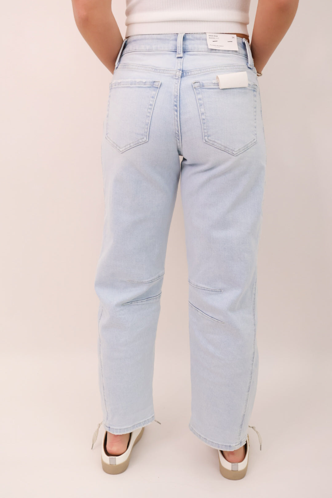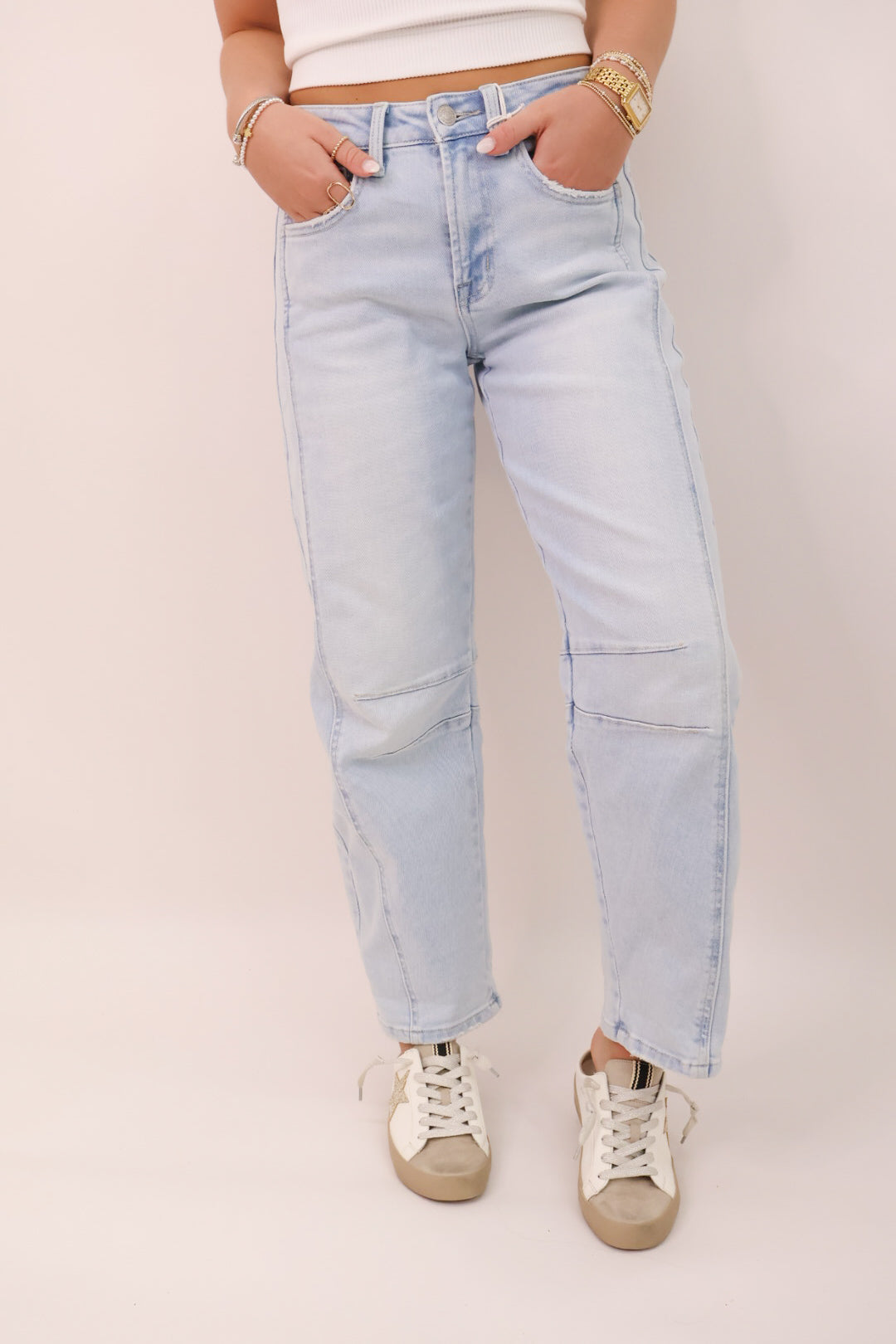 Step up your denim game with our Flying Monkey Light Wash Barrel Jeans—the perfect blend of on-trend style and everyday comfort. Featuring a relaxed barrel-leg silhouette, these jeans offer a flattering, fashion-forward fit with a high-rise waist and a lived-in light wash. The structured yet comfy denim provides just the right amount of movement, making them perfect for dressing up with heels or keeping it casual with sneakers.