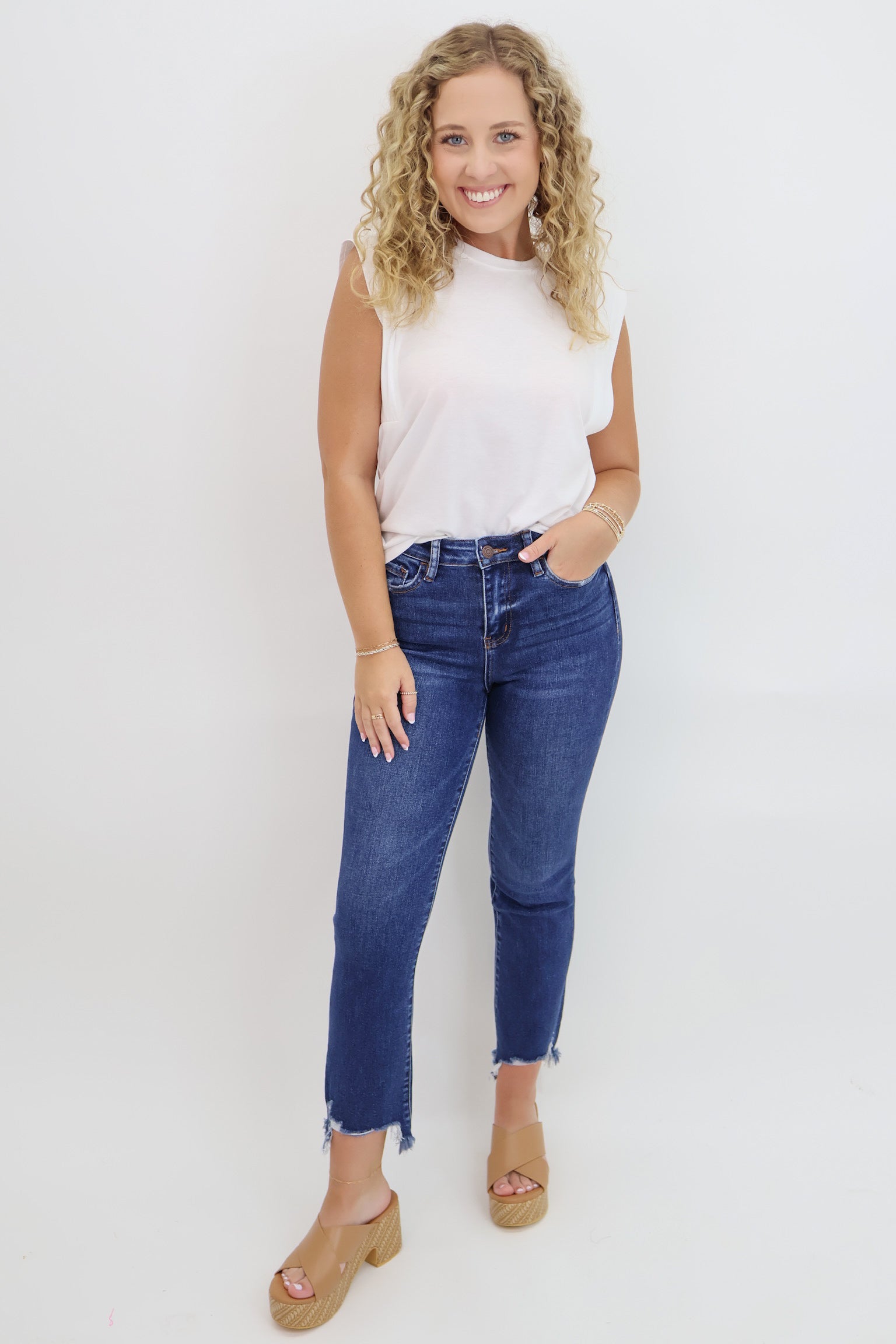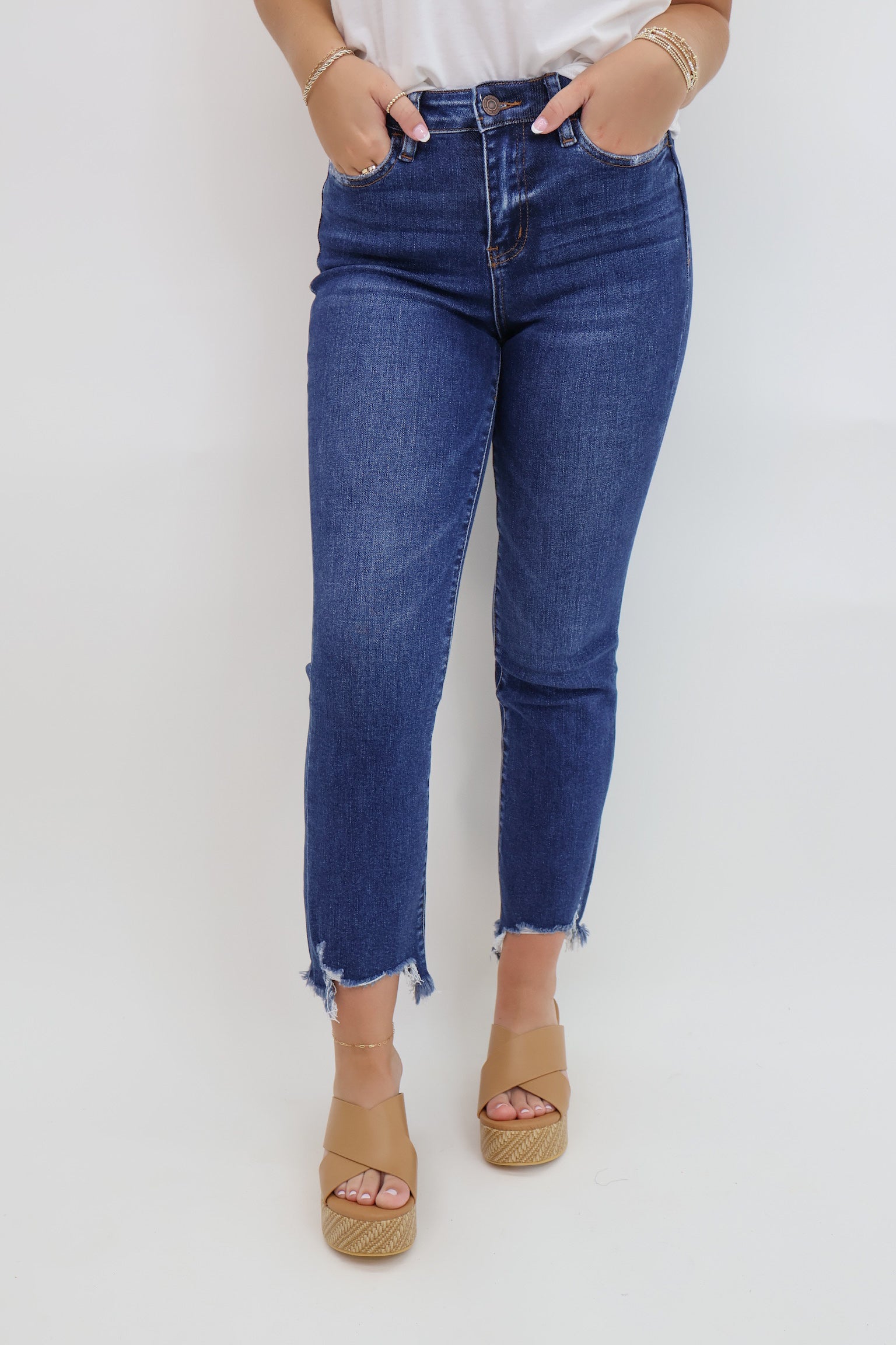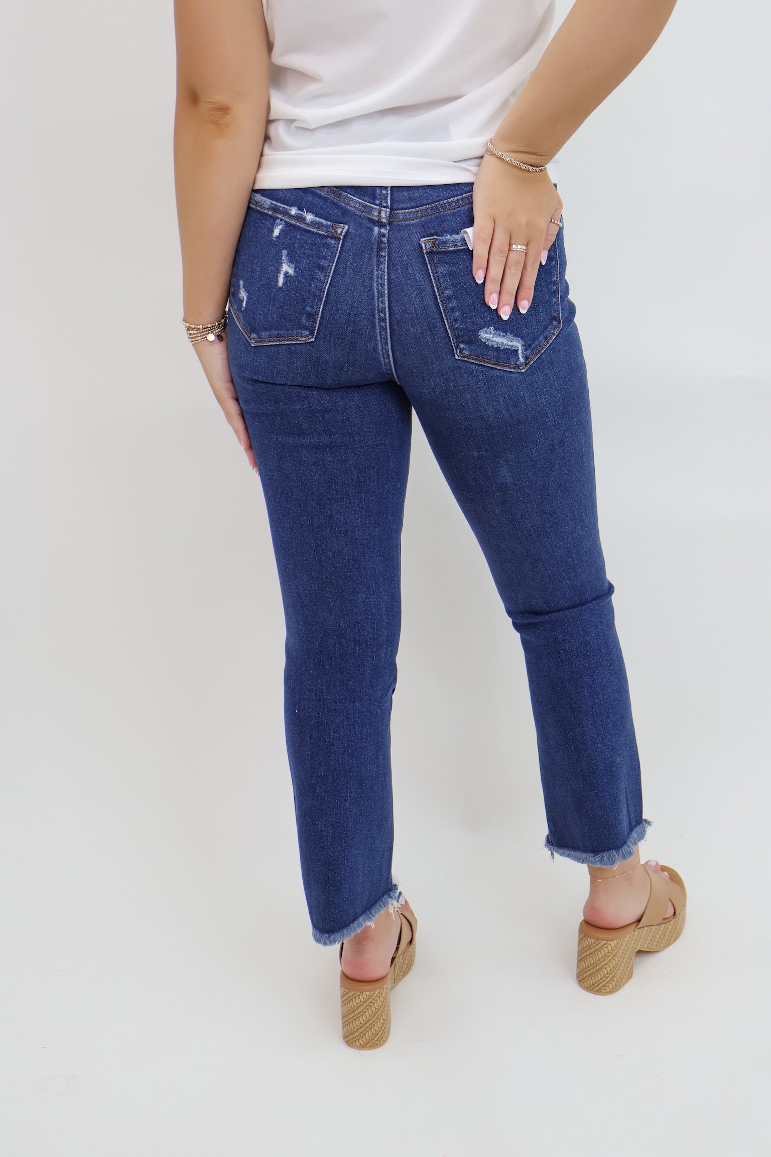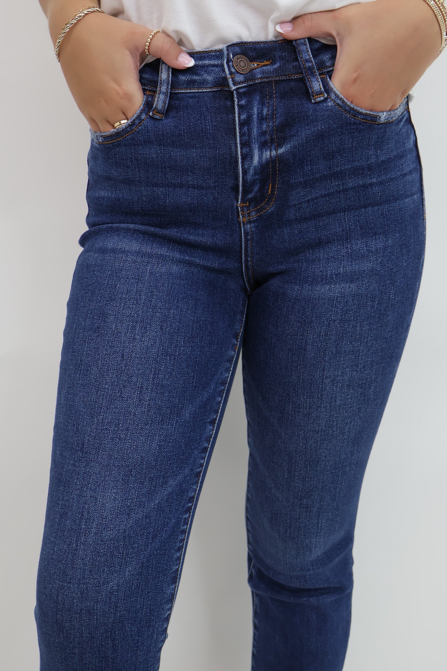 BEST SELLING DENIM! Elevate your denim game with the Vervet Bella high rise dark wash jeans. Made with comfort stretch denim and featuring a high rise waist, distressed hem, cropped length, and kick flare style, these jeans provide both style and comfort. Take on Fall confidently in these must-have jeans- they pair perfectly with booties!
