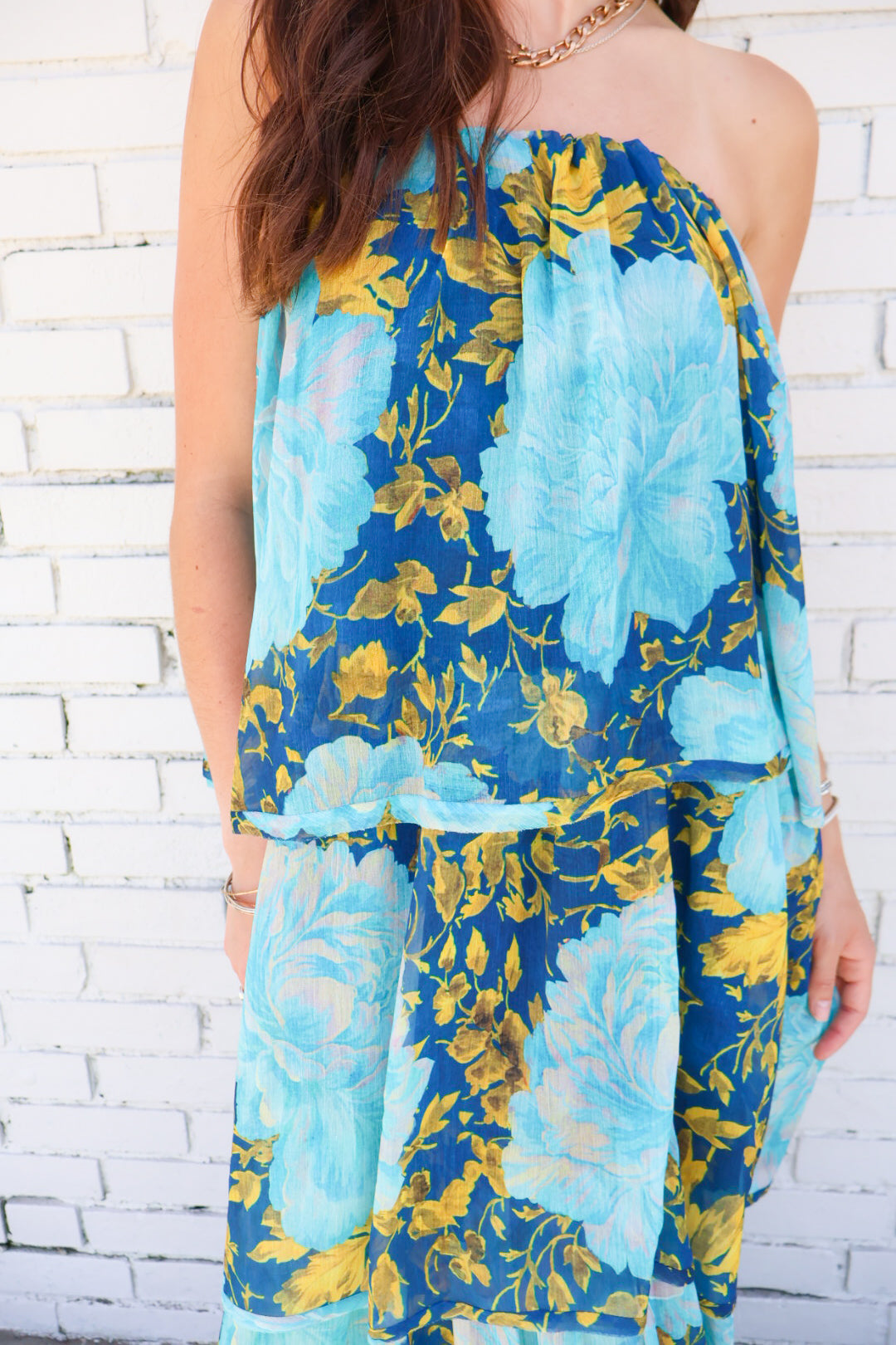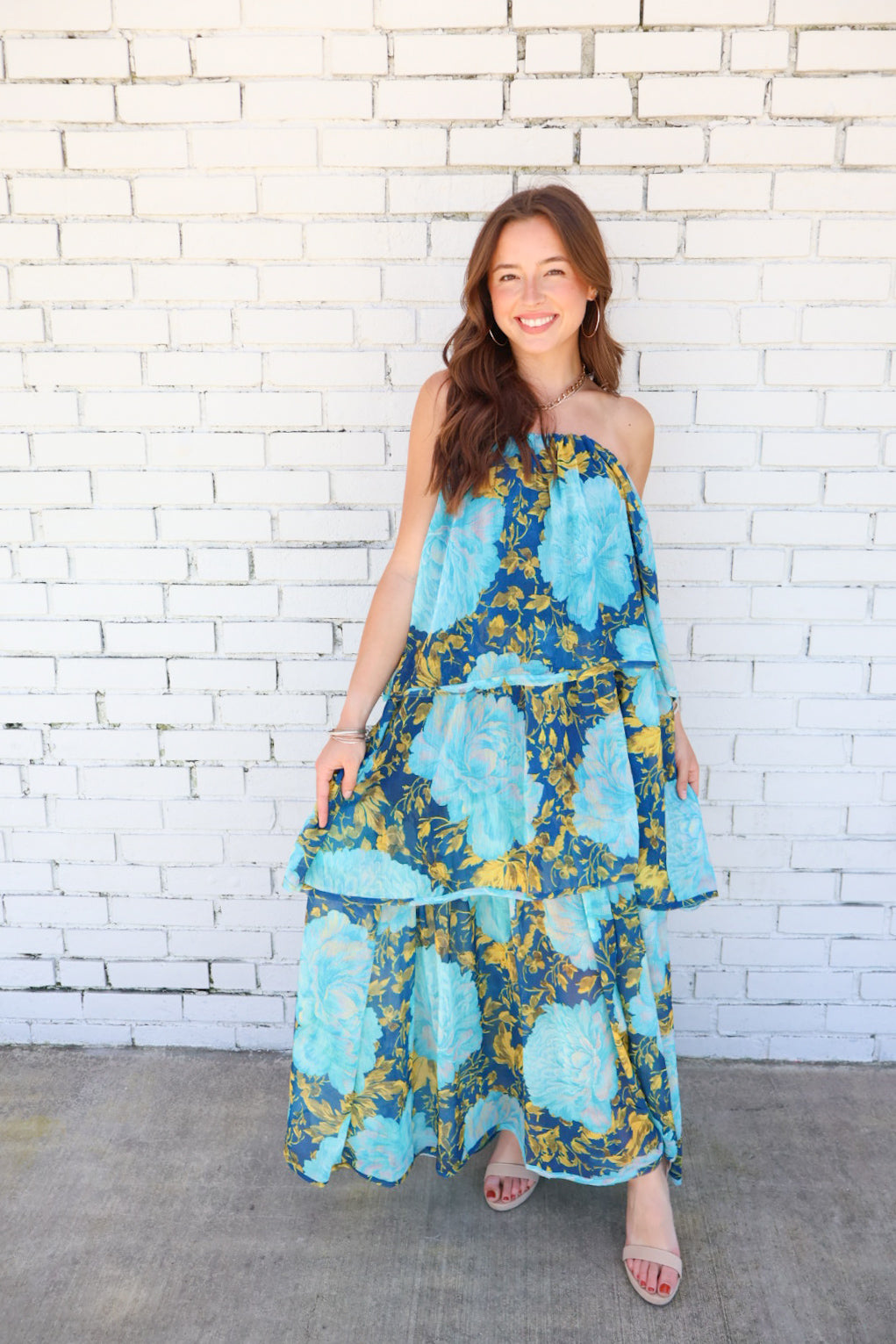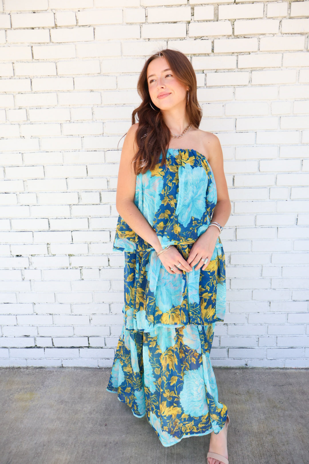 When your outfit needs to do all the talking, this dress is the answer. Featuring an oversized floral print in deep navy, turquoise, and golden marigold, this strapless tiered maxi is truly a showstopper. The airy woven fabric flows effortlessly while the layered silhouette creates that breezy, ethereal movement we all love in summer.