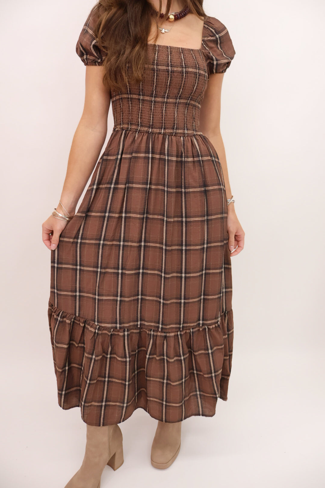 brown plaid midi dress, smocked bodice fall dress, puff sleeve plaid dress, tiered ruffle plaid midi, casual plaid dress for women, family photo oufit inspo
