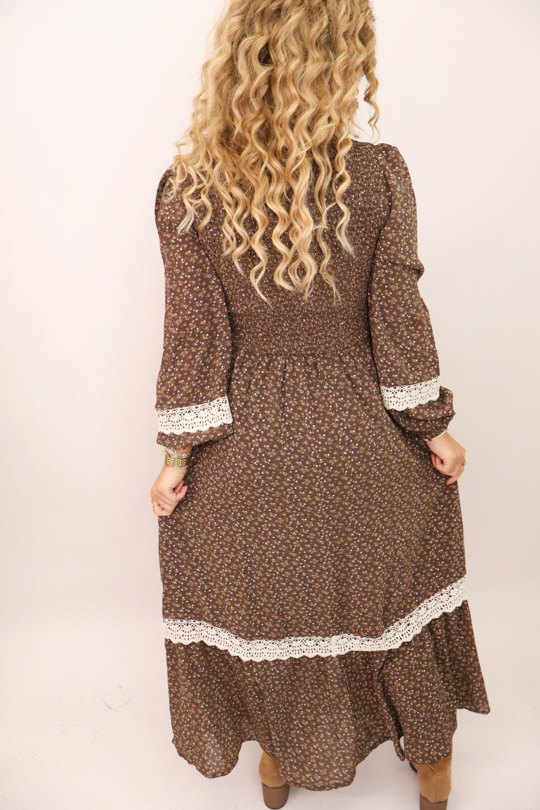 brown floral maxi dress, lace trim fall dress, boho Thanksgiving outfit, long sleeve floral dress, feminine fall maxi, romantic lace dress, Friendsgiving outfit inspo