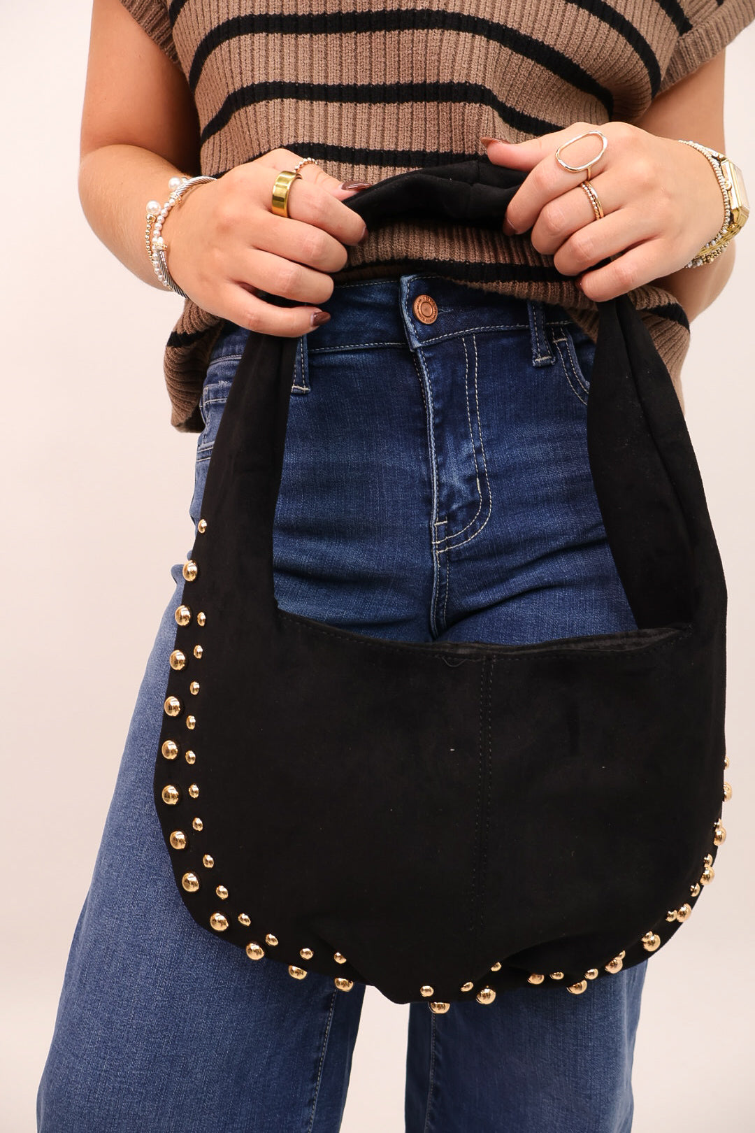 The perfect mix of chic and functional, this Faux Suede Studded Bag is your go-to accessory for fall! Crafted from soft faux suede and detailed with gold studs, it has a magnetic closure that keeps everything secure while still being easy to grab and go. Just the right size for all your essentials, it’s an effortless finishing touch for both daytime errands and nights out.