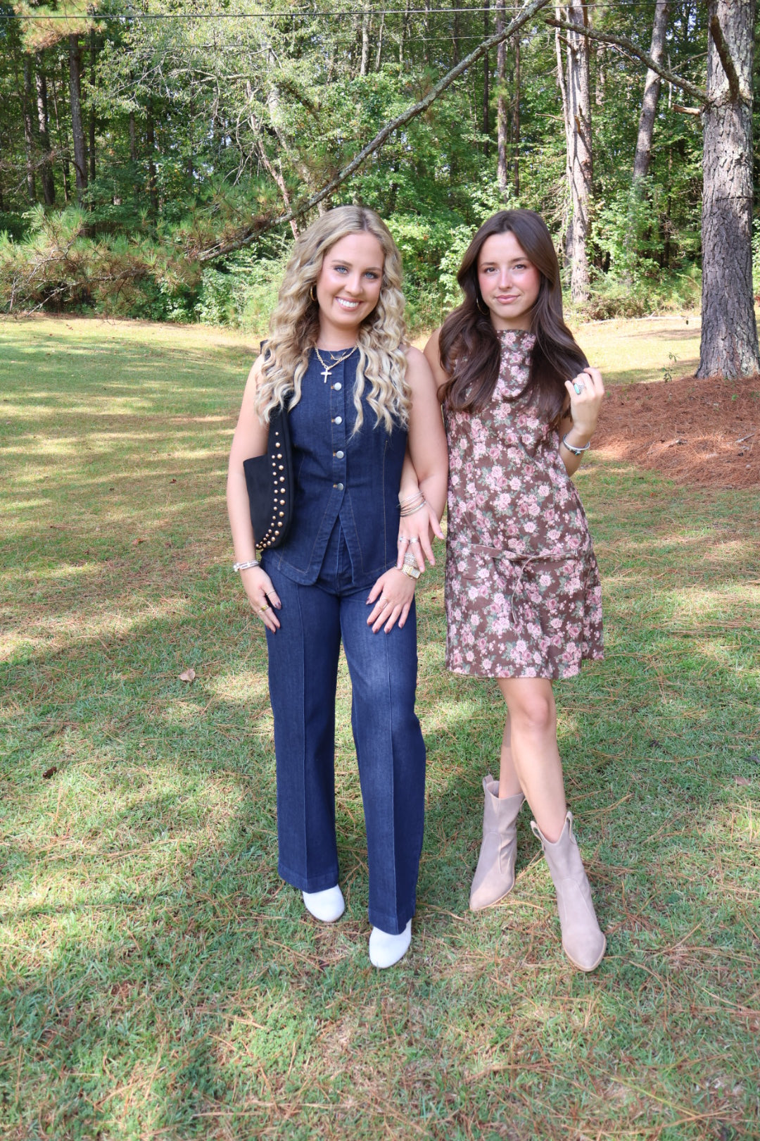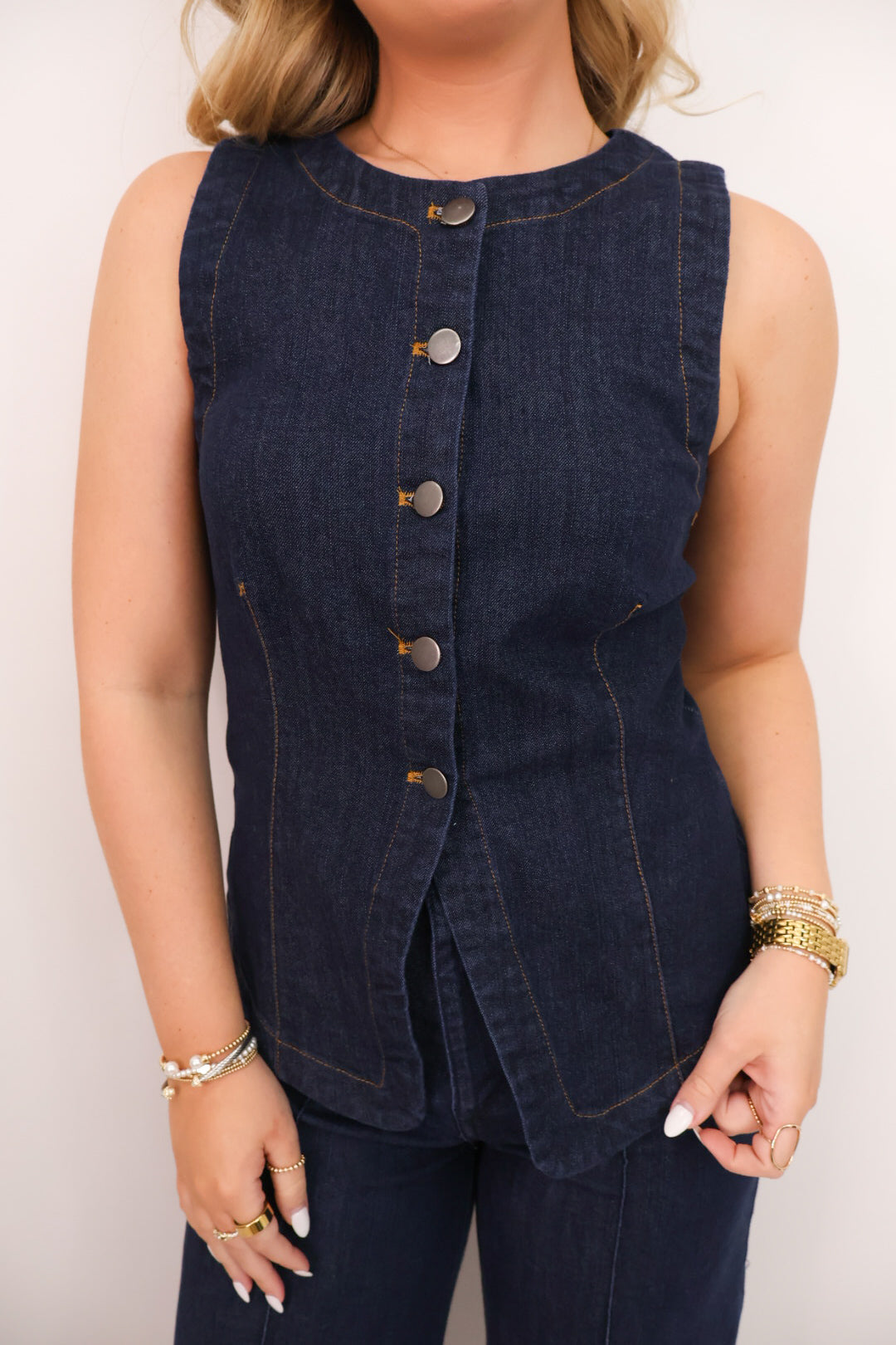 - Matching denim set with vest + wide-leg pants