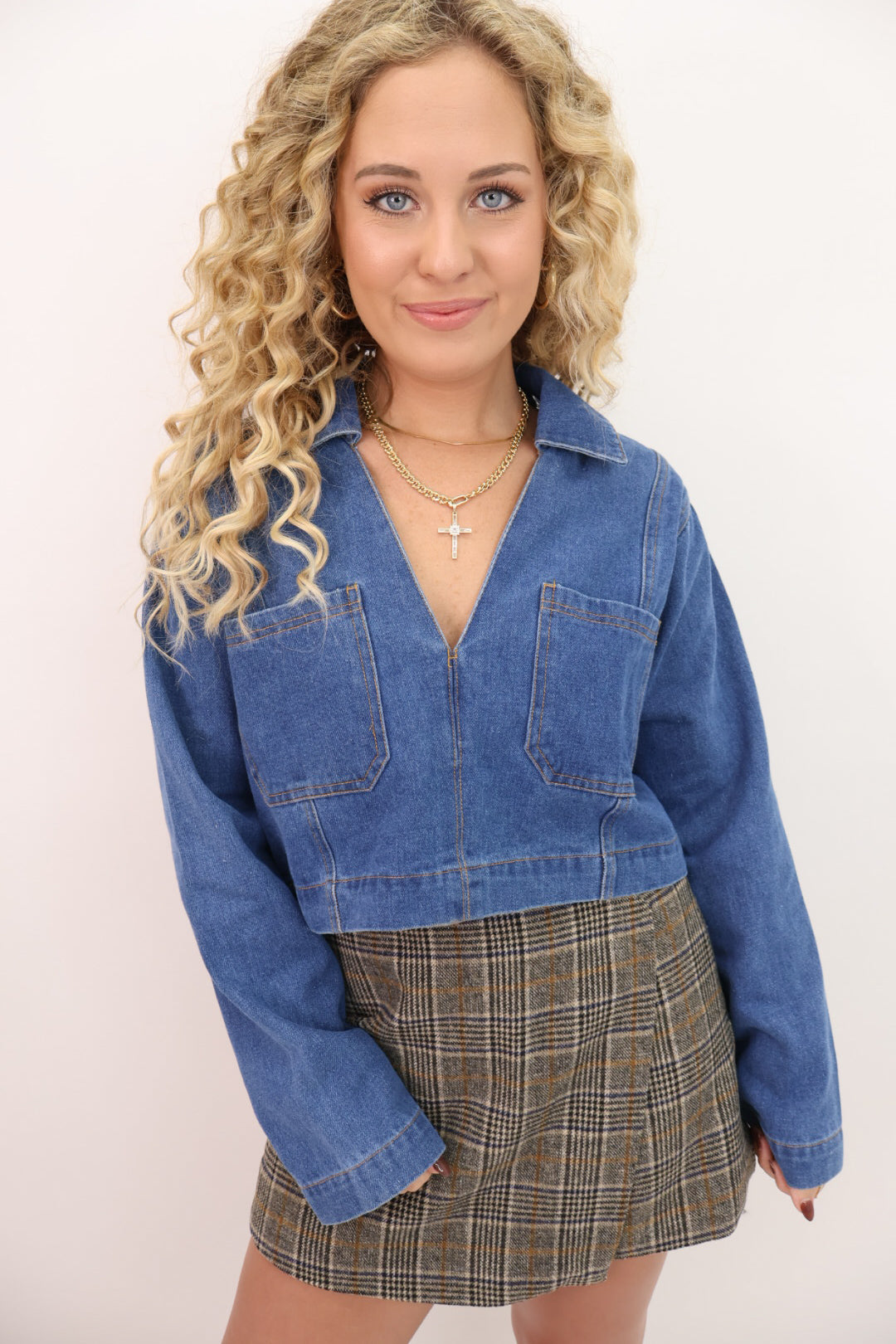 Meet your new closet staple with a twist—the Cropped Denim Long Sleeve Top! Designed in a medium wash denim, this top features a modern cropped silhouette with a relaxed fit, utility-inspired pockets, and a flattering V-neckline. It’s versatile enough to style casual with sneakers and joggers, or elevate with a plaid skirt and boots for a chic fall vibe. The soft yet structured denim fabric gives just the right amount of polish, making this piece a go-to for layering all season long!