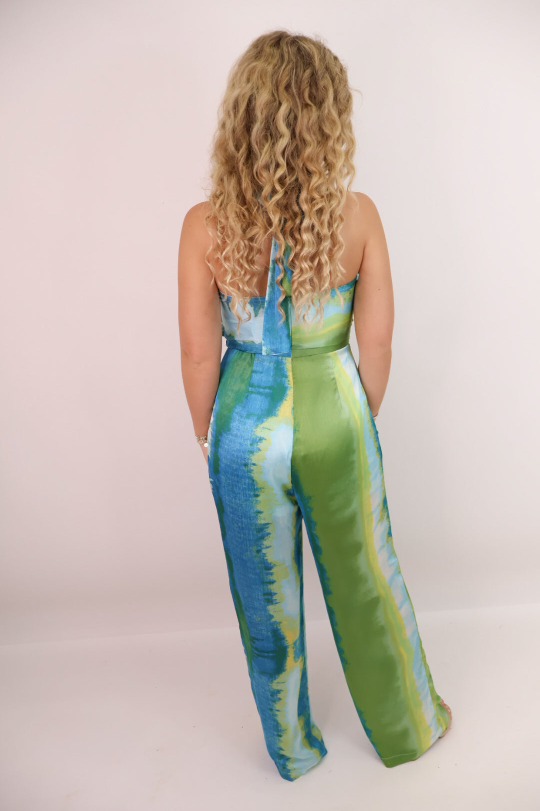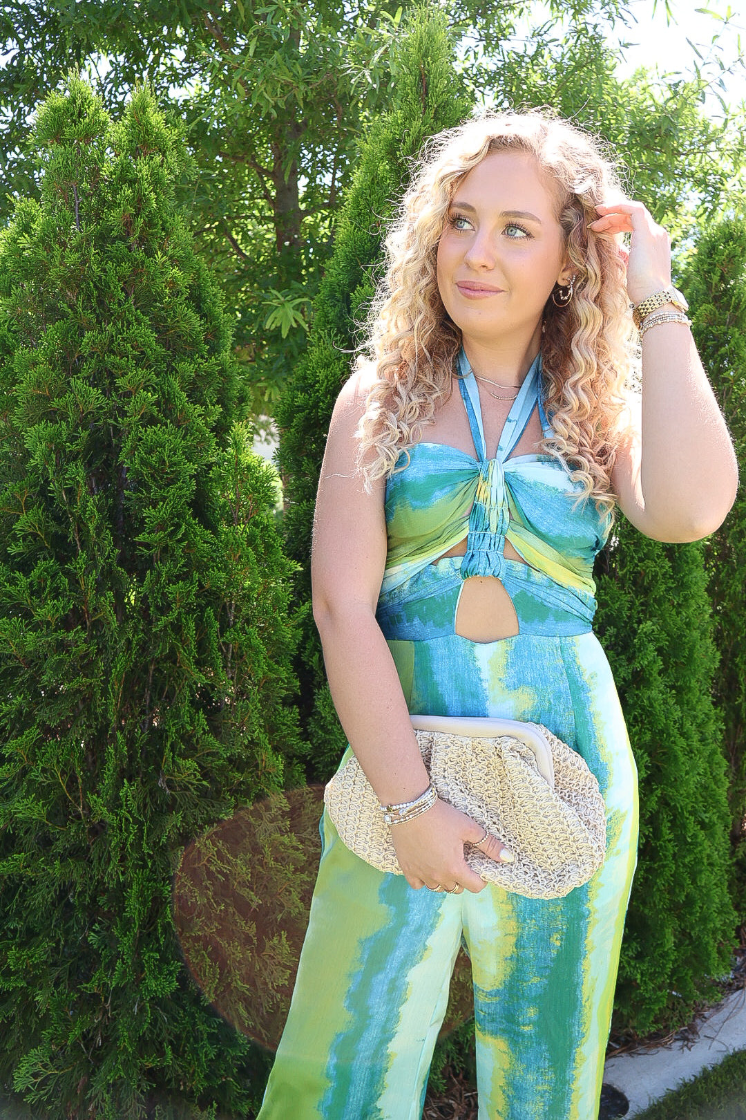 cutout jumpsuit, halter vacation jumpsuit, wide leg summer jumpsuit, watercolor print outfit, beach dinner outfit, resortwear jumpsuit, silky printed jumpsuit, statement jumpsuit for vacation, bold blue green jumpsuit, The Destination Edit