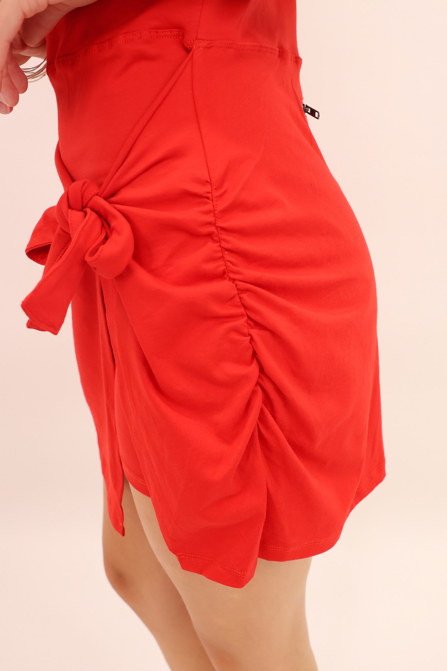 Say hello to your new go-to athletic piece! This red athletic style features a sleek, body-skimming silhouette with built-in shorts for comfort and coverage. The front is finished with a self-tie sash detail that cinches your waist while keeping things sporty-cute, and the scoop back adds an unexpected feminine touch. Breathable, stretchy, and made for the gym, errands, or cheering on your team, this piece was built for long days!