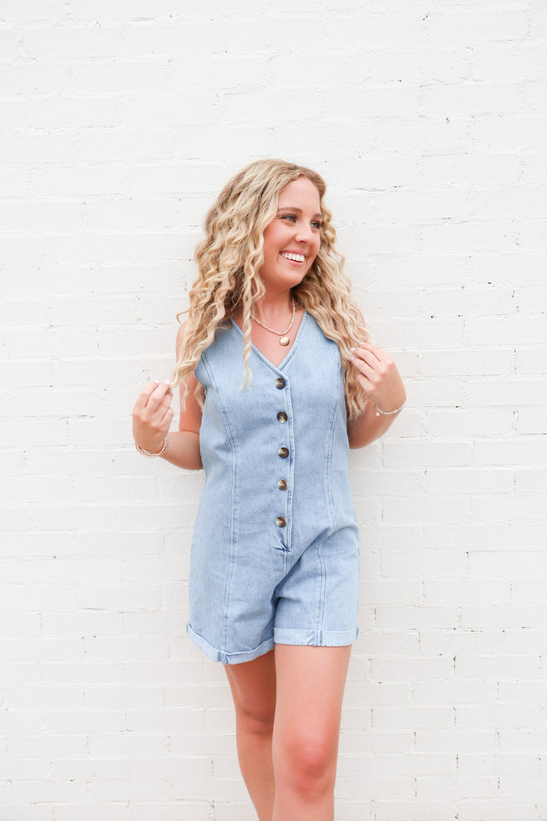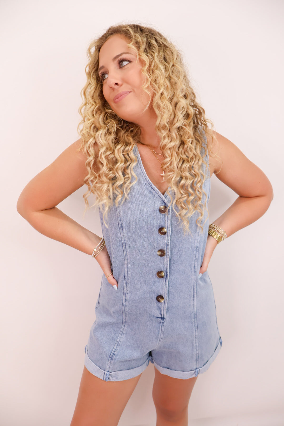 Easy, breezy, and made for summer adventures—our Button Front Denim Romper is a one-and-done piece that checks every box. Made from lightweight, soft-washed denim, this romper features a relaxed fit, adjustable button front, and the cutest rolled hem shorts. It’s effortlessly cool and gives just the right amount of structure without feeling stiff.
