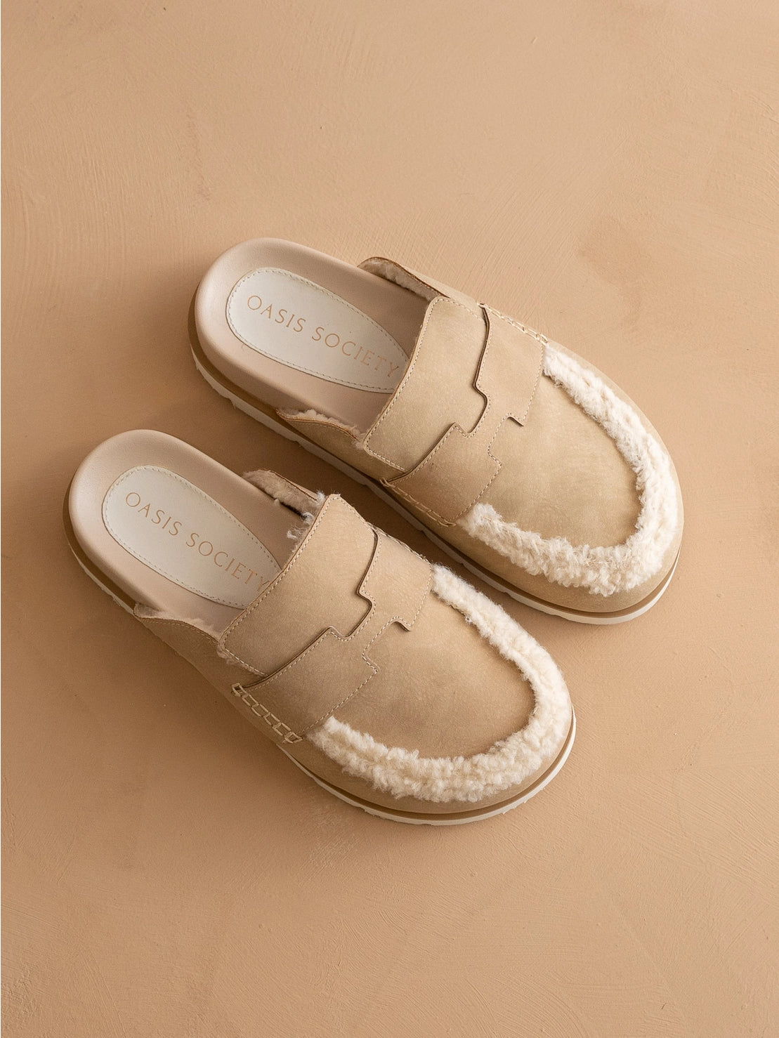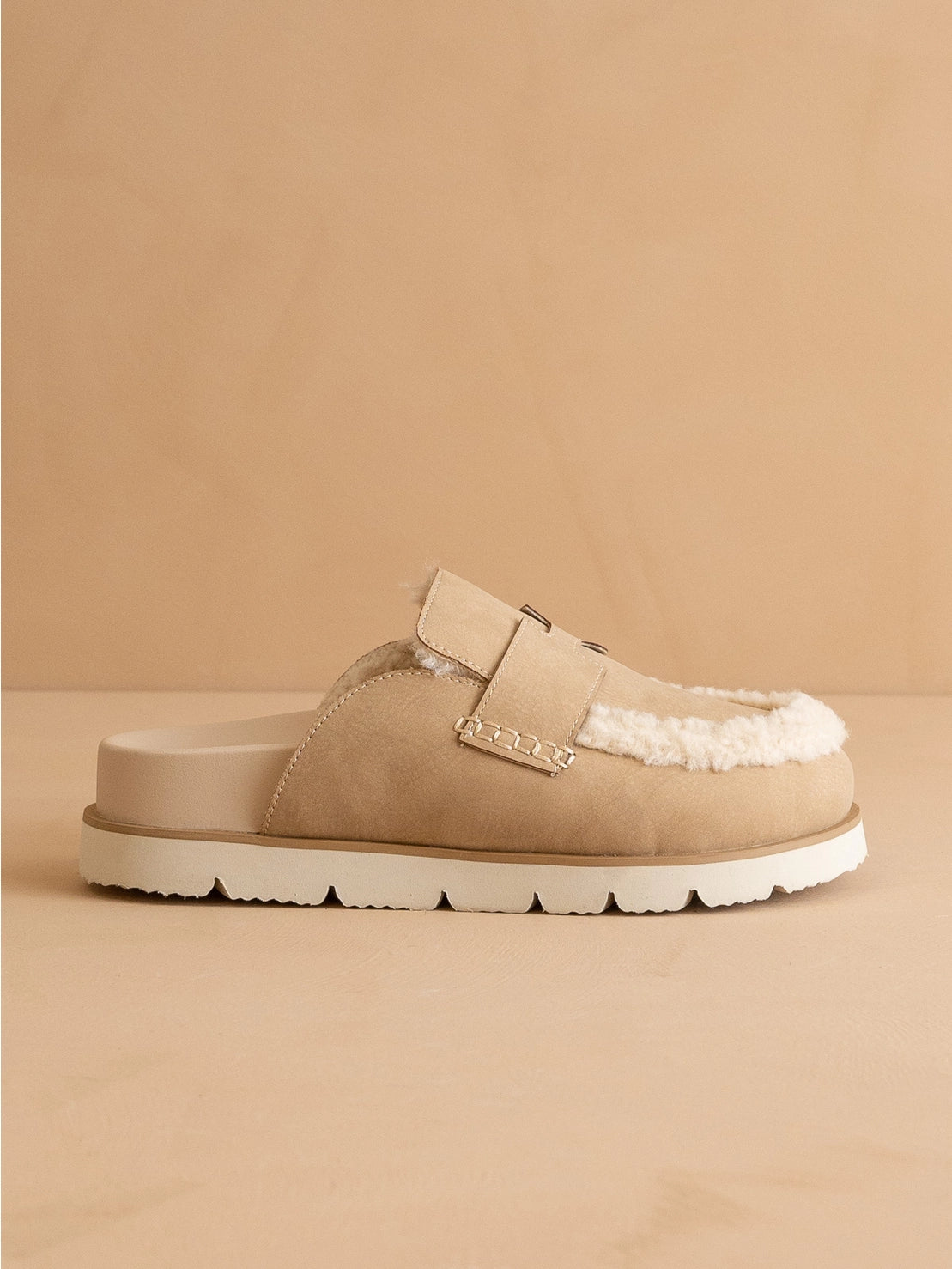 shearling mule shoes, cozy slip on mules, oatmeal suede mules, fall casual shoes, faux shearling clogs