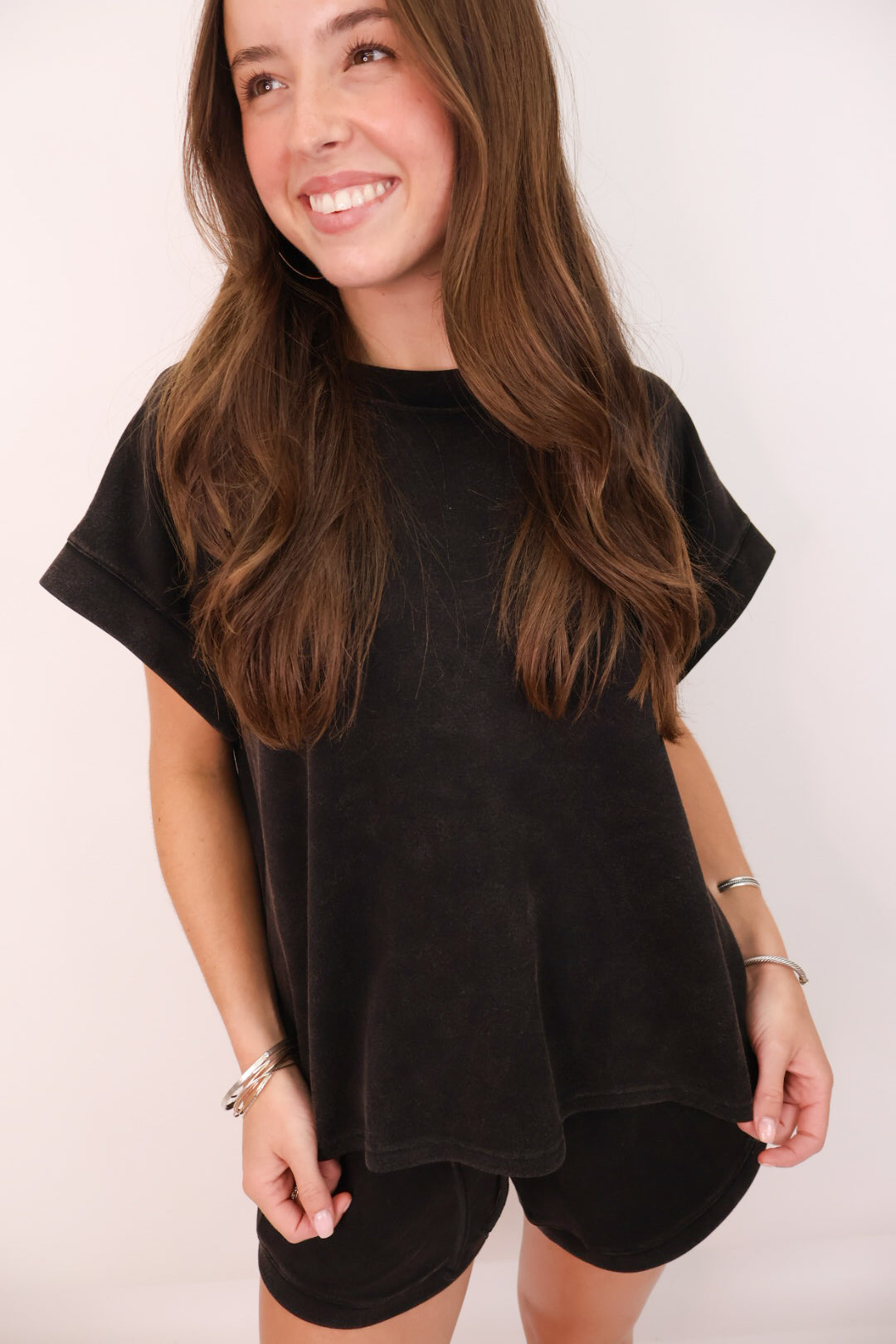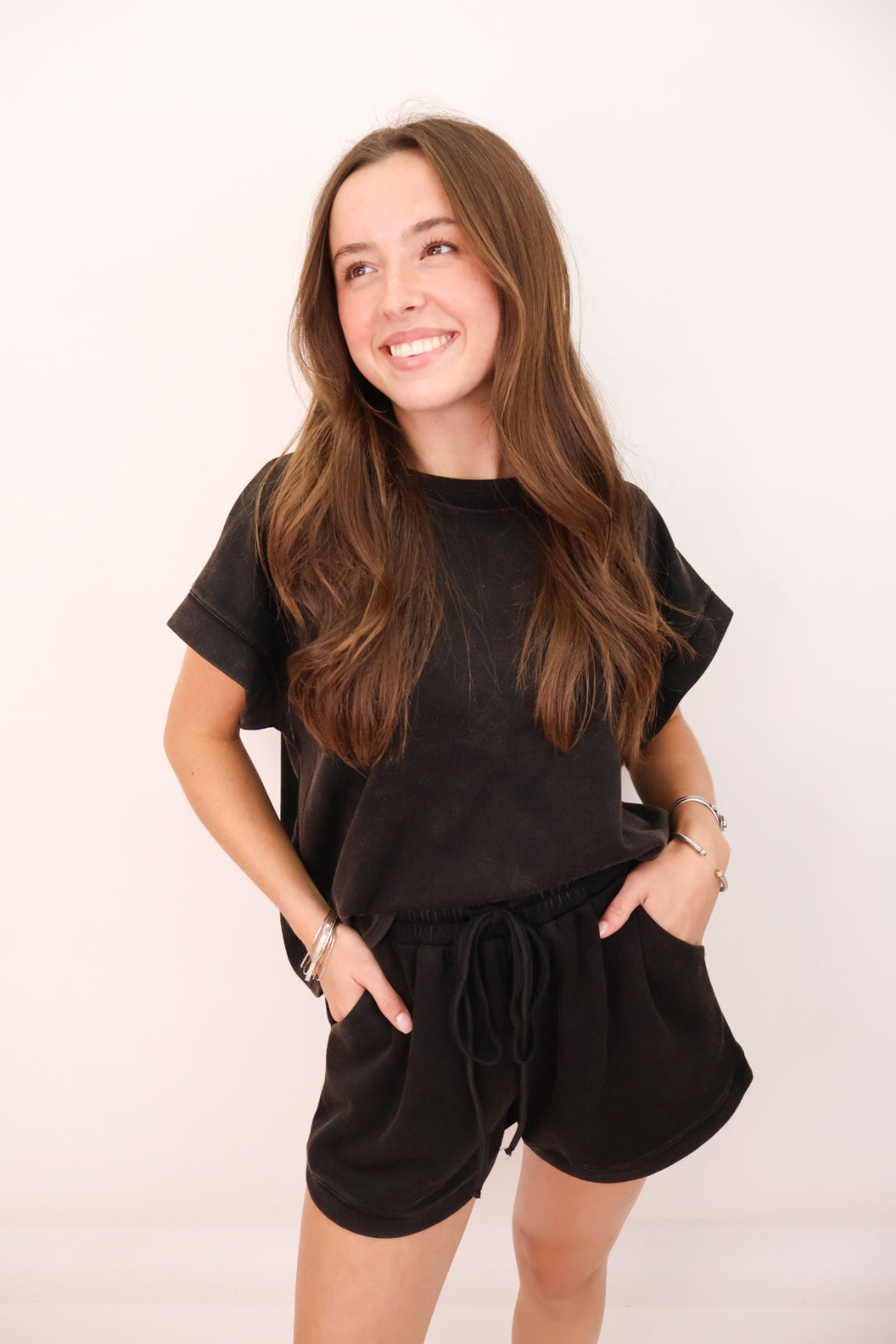 mineral washed lounge set, oversized lounge set, casual two piece set, cotton matching set, comfy summer set, women’s lounge outfit, mineral wash shorts and top, casual gameday set, casual black shorts set