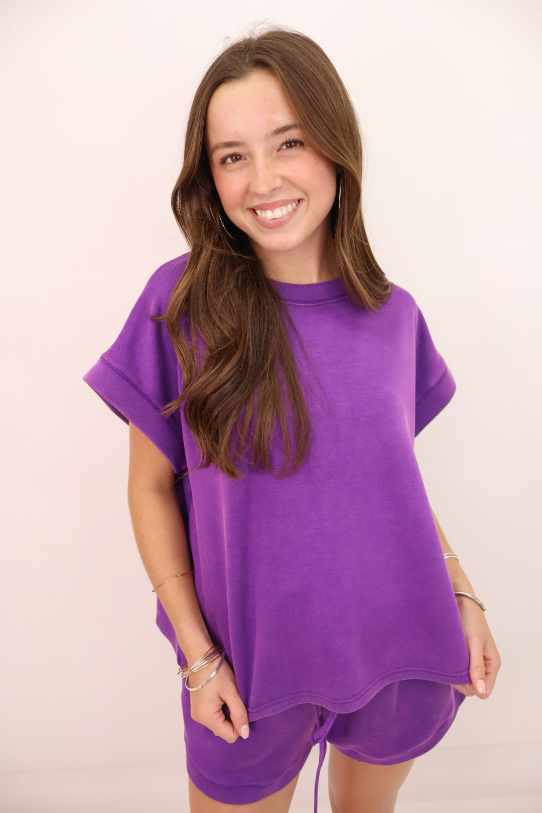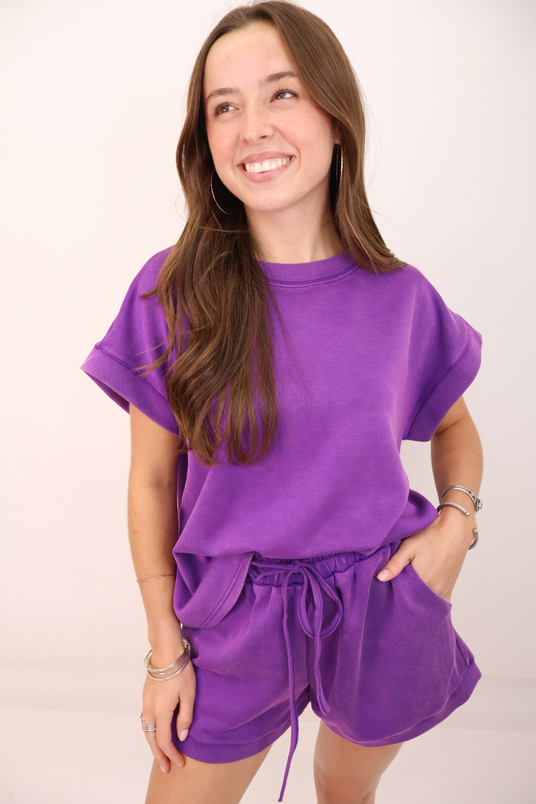 mineral washed lounge set, oversized lounge set, casual two piece set, cotton matching set, comfy summer set, women’s lounge outfit, mineral wash shorts and top, casual gameday set, purple casual shorts set