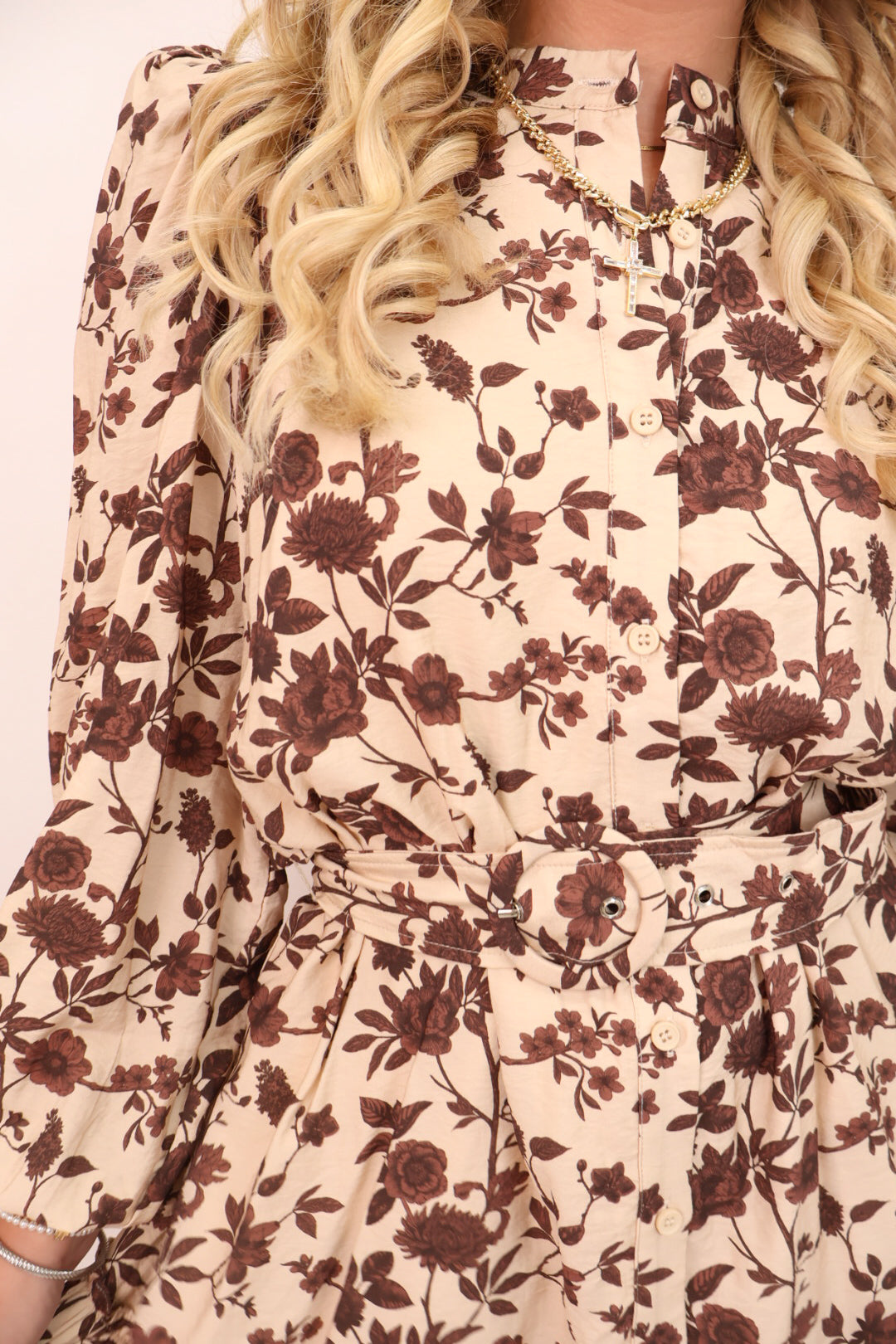 Cream & Brown Floral Belted Dress