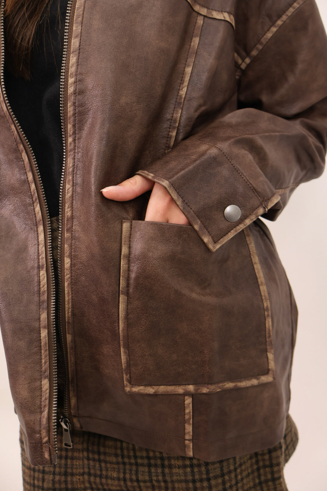 Give your look that effortlessly cool finish with our Vintage Edge Faux Leather Jacket! Crafted from a soft, worn-in vegan leather with subtle seam detailing, this jacket blends laid-back and luxe perfectly. Its relaxed fit and zip front make it easy to throw on over everything from cozy knits to floral dresses — the perfect piece for transitional weather and beyond!