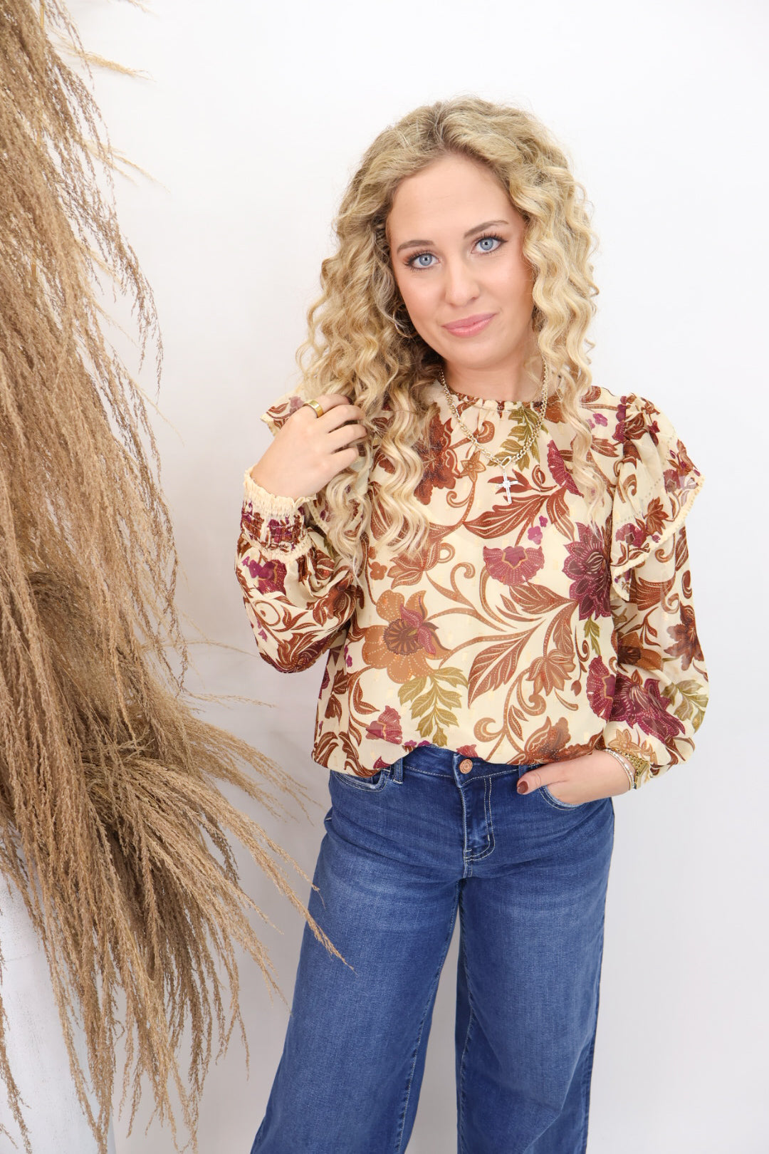 Rich tones and romantic details make this blouse a standout piece for fall! The Burgundy & Rust Floral Ruffle Shoulder Blouse features a warm floral print in shades of deep burgundy, rust, and cream — the kind of palette that instantly feels like autumn. Designed with a relaxed fit and delicate ruffle detailing along the shoulders, it blends femininity with a touch of playful edge.