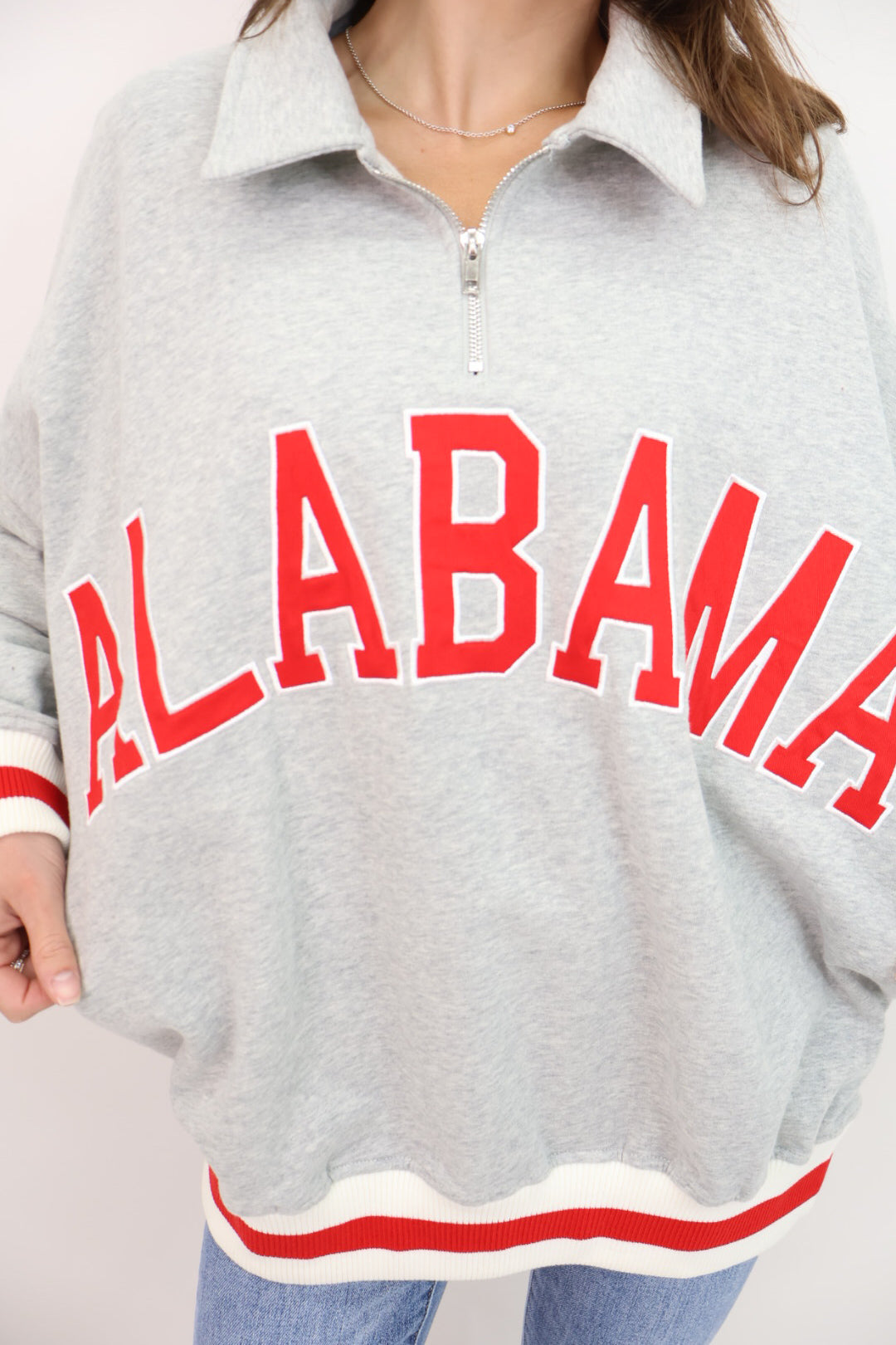 Game day comfort meets classic Crimson Tide style in this Alabama Appliqué Quarter Zip Pullover. Crafted from soft fabric, this oversized sweatshirt features a bold, stitched “ALABAMA” appliqué across the chest in standout crimson. The relaxed fit, zip neckline, and striped ribbed cuffs and hem give it that vintage-athletic feel we love — perfect for throwing on over leggings or denim.