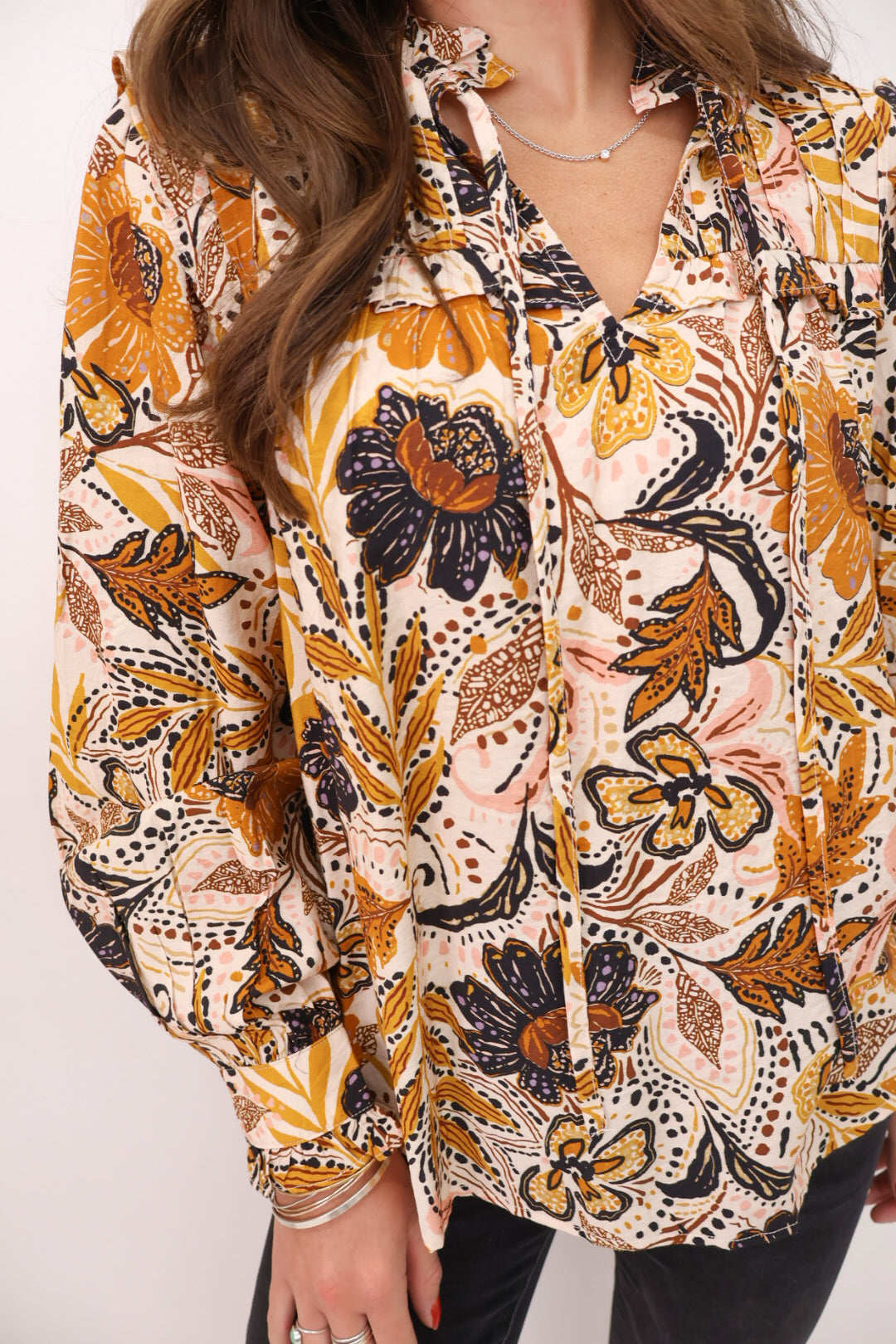 fall floral blouse, mustard floral top, long sleeve button blouse, autumn outfit ideas, dressy casual fall tops, women’s printed fall tops