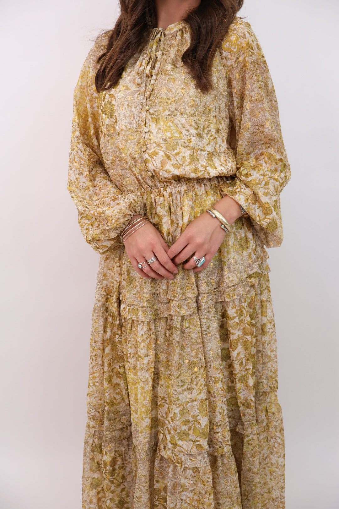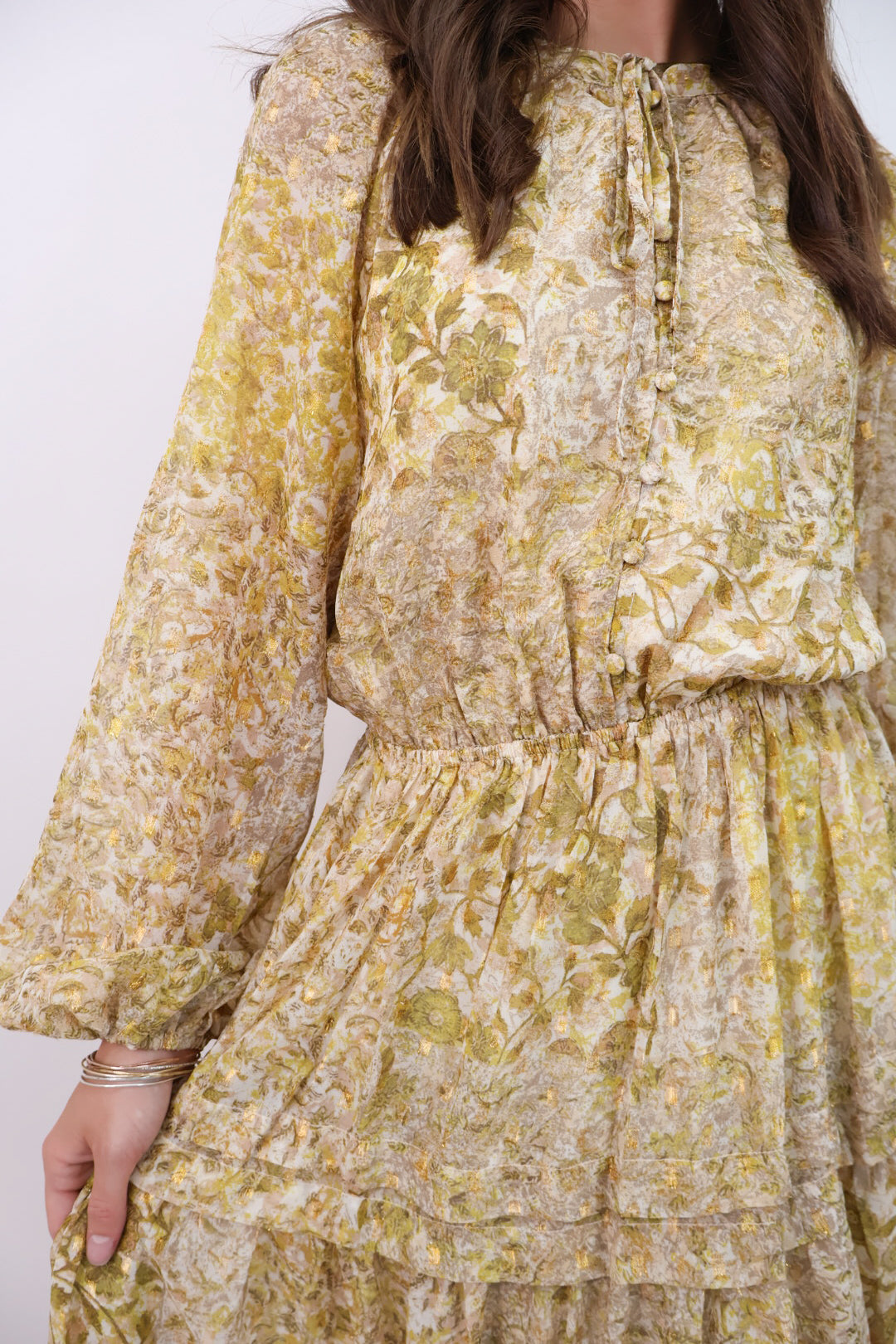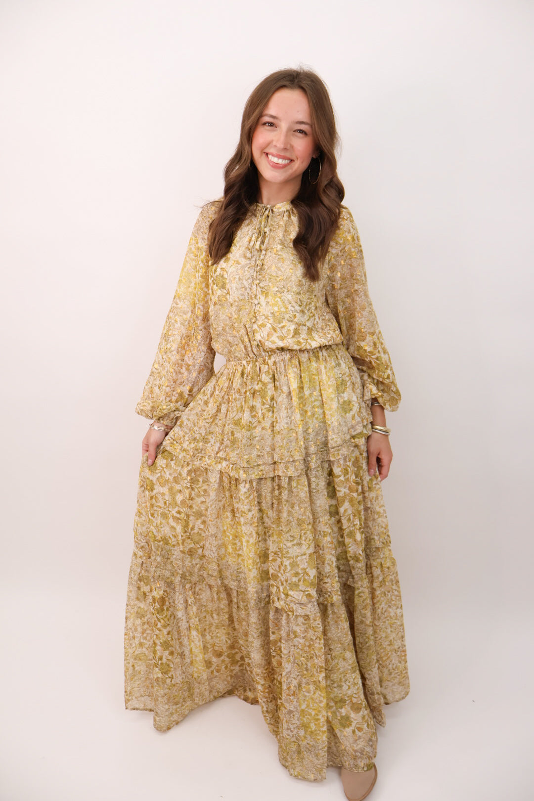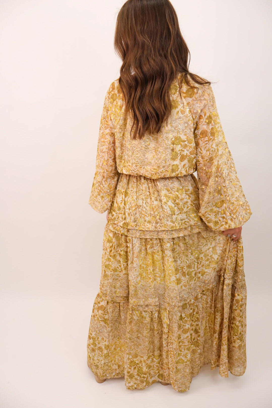 Make a statement in our floral print chiffon maxi dress! The stunning mustard floral design is complemented by the shimmering gold metallic threading, making it a truly eye-catching piece. The elastic waist and blousy fit provide both comfort and style, while the flowy skirt adds a touch of elegance. The perfect choice for any fall event!